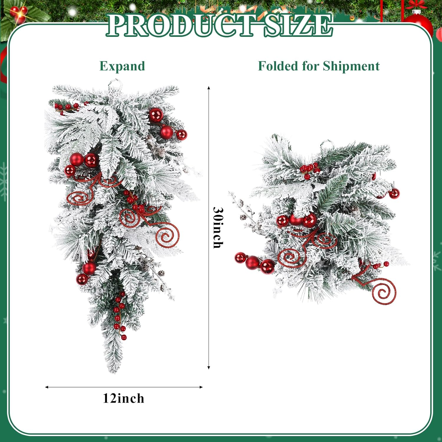 SHACOS 30" Flocked Christmas Teardrop Swag Artificial Snow Pine Spruce Cedar Decorative Swag Red Berries Christmas Balls Pine Cones Swag for Front Door Window Wall Stairs Xmas Decor