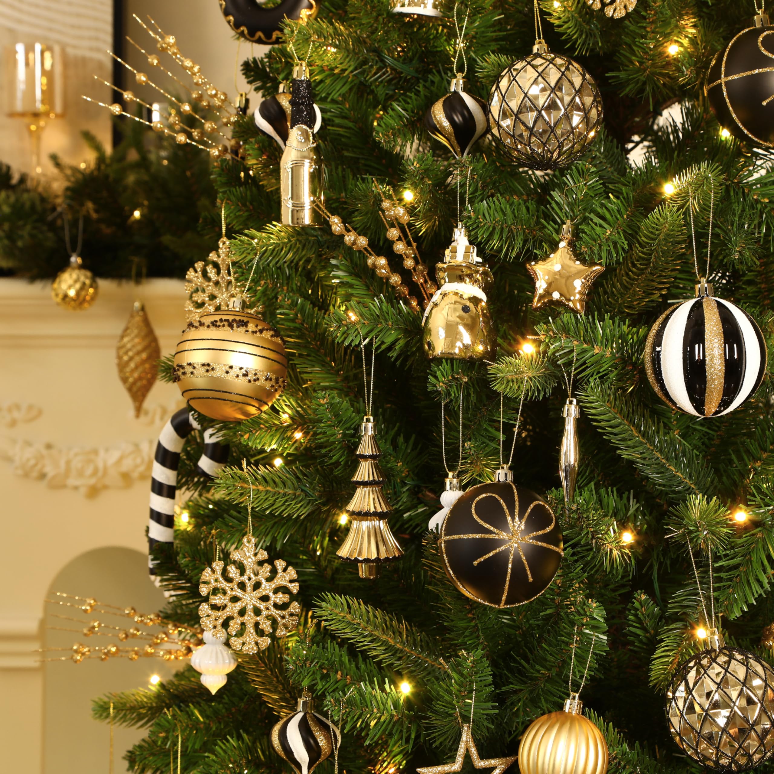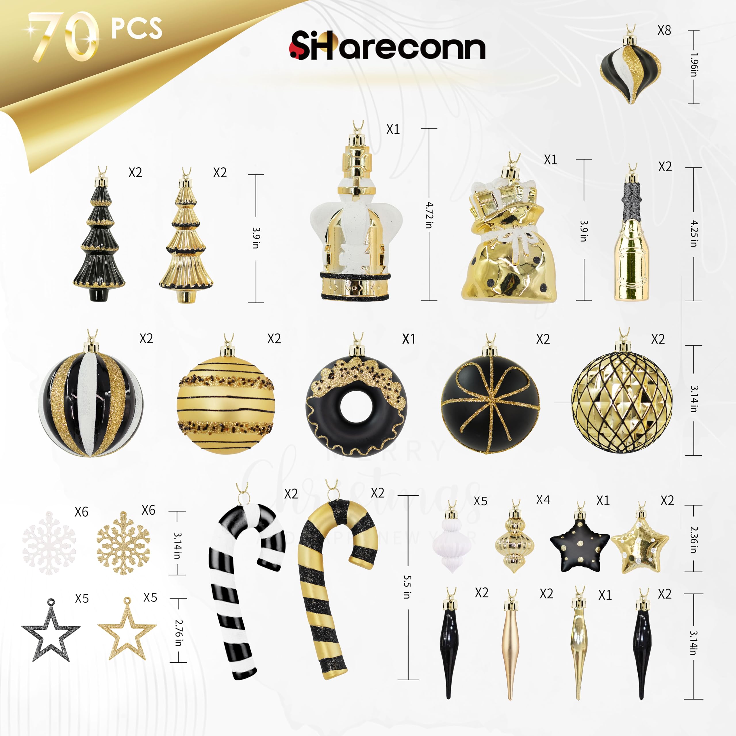 SHareconn 70pcs Christmas Balls Ornaments Set, Shatterproof Plastic Baubles, Ribbon and Tree Topper for Xmas Tree Holiday Wedding Party Decorations with Hanging Strings, Black, White and Gold