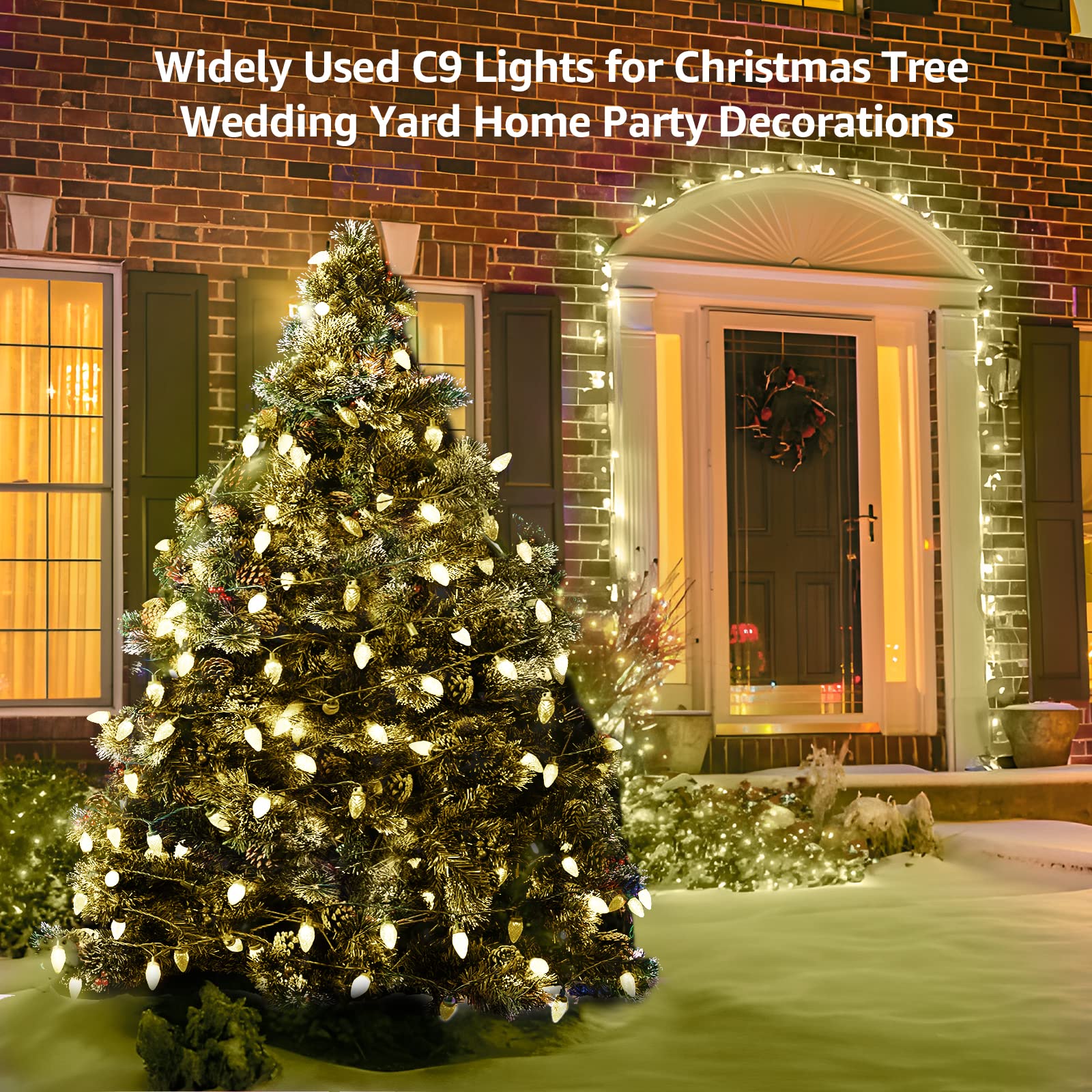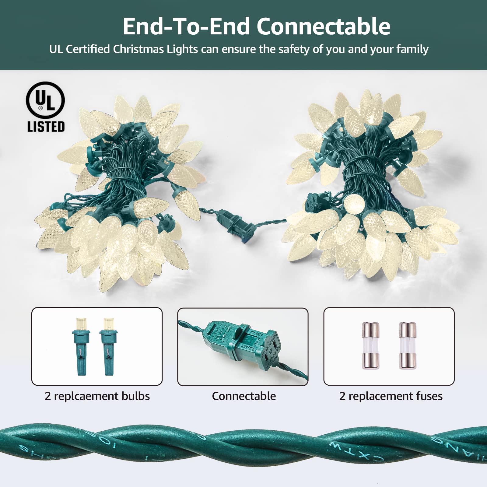 UL Outdoor Christmas Lights: Strictly tested and meets the US requirements of string lights UL safety standards to ensure & maximize the safety. Whole set string lights including string wire, led lights and plug have been by UL. Pterfect outdoor indoor decorations for Christmas, Thanksgiving, Halloween, bar, restaurant, hotel, commercial building, shopping center,party, yard, balcony, garden, pergola, gazebo, especially for trees and eaves. Durable and Sturdy Design: Different from other C9 Christmas lights with weakly and very thin wires, they usually break apart easily when use in eaves or trees. We use the high quality and durable green wires. The strong construction makes it tough and sturdy, not easy to break apart and overheat after long hours of usage. They are strong enough to provide years of high quality lighting. We also provide 2 spare bulbs and 2 spare fuse for repair (basically no need to use).
