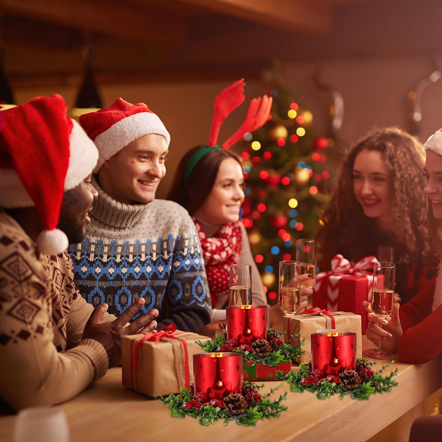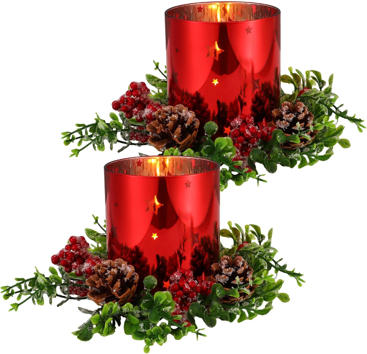 Sliner 4 Pcs Christmas Glass Candle Holders 4.7 inch Glass Xmas Candle Holder, 2 Pcs Votive Candle Berry Ring with Pinecones and 2 Pcs Christmas Candle Holders Decorative for Table Centerpieces Decor
