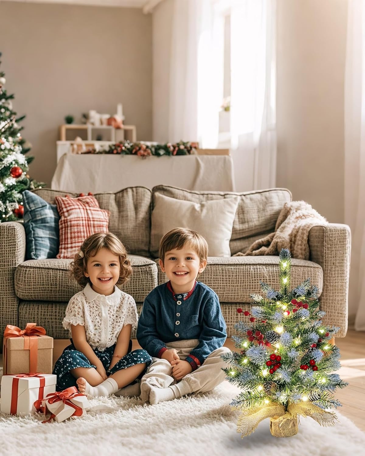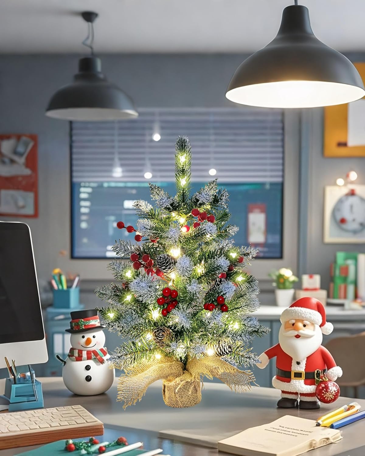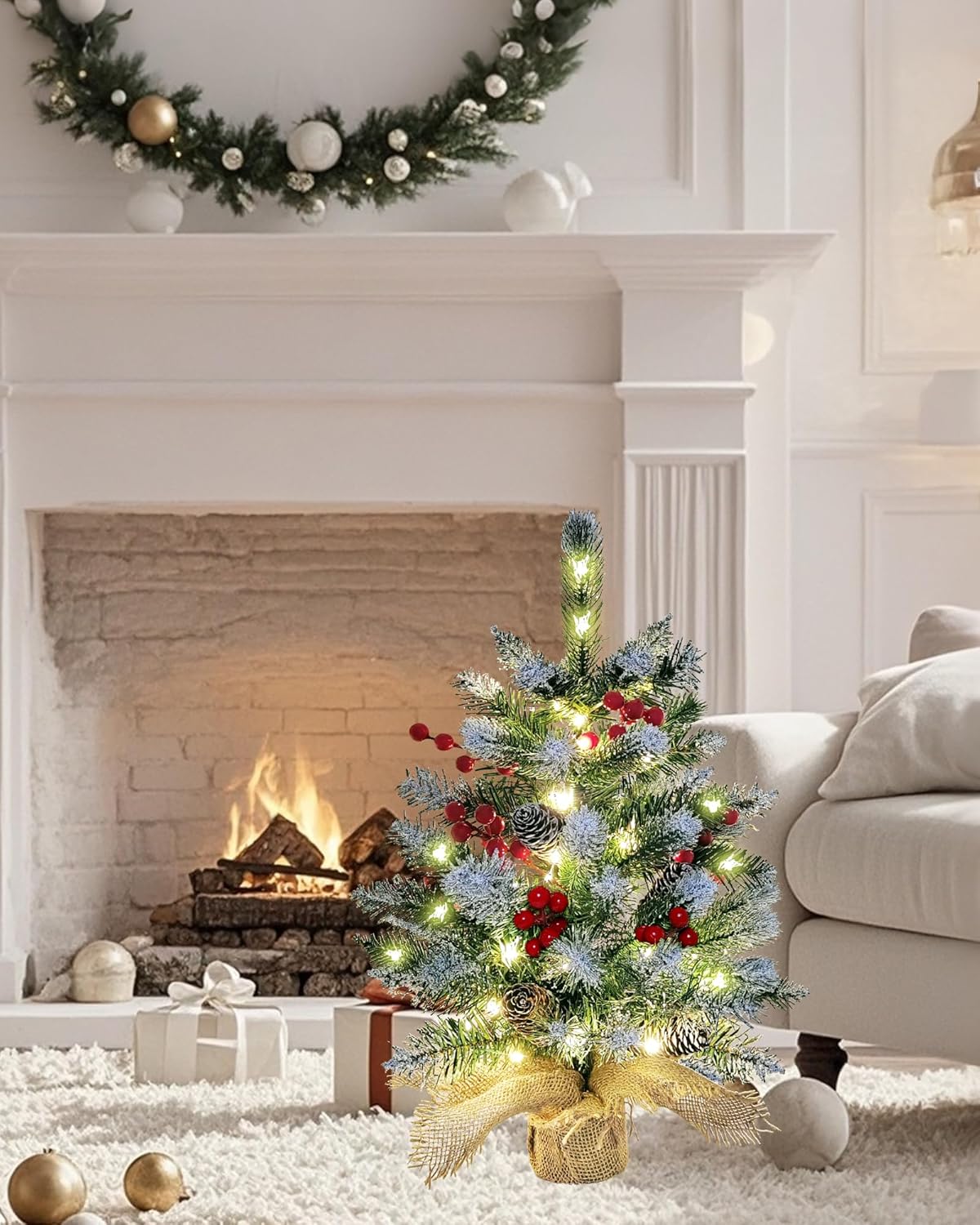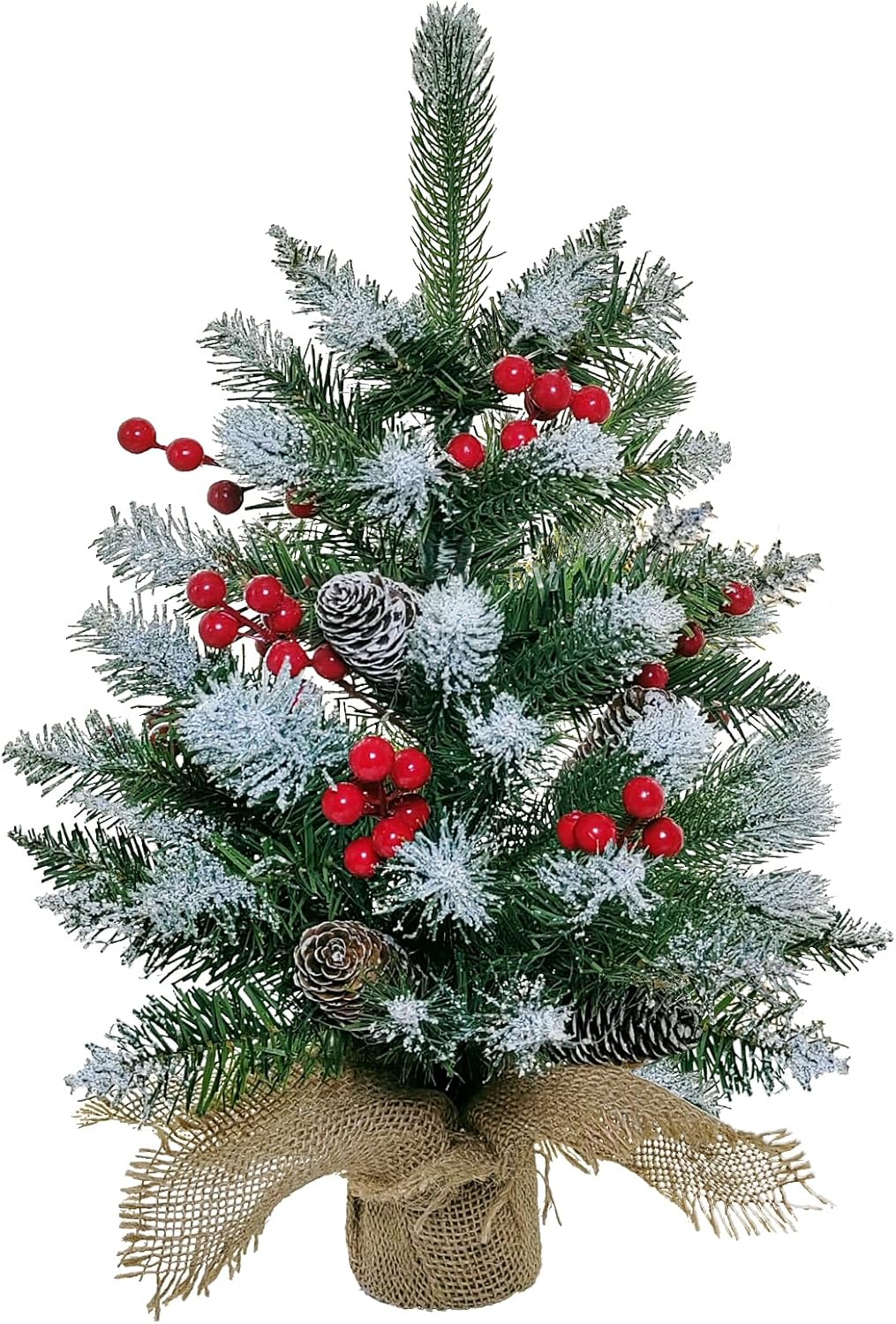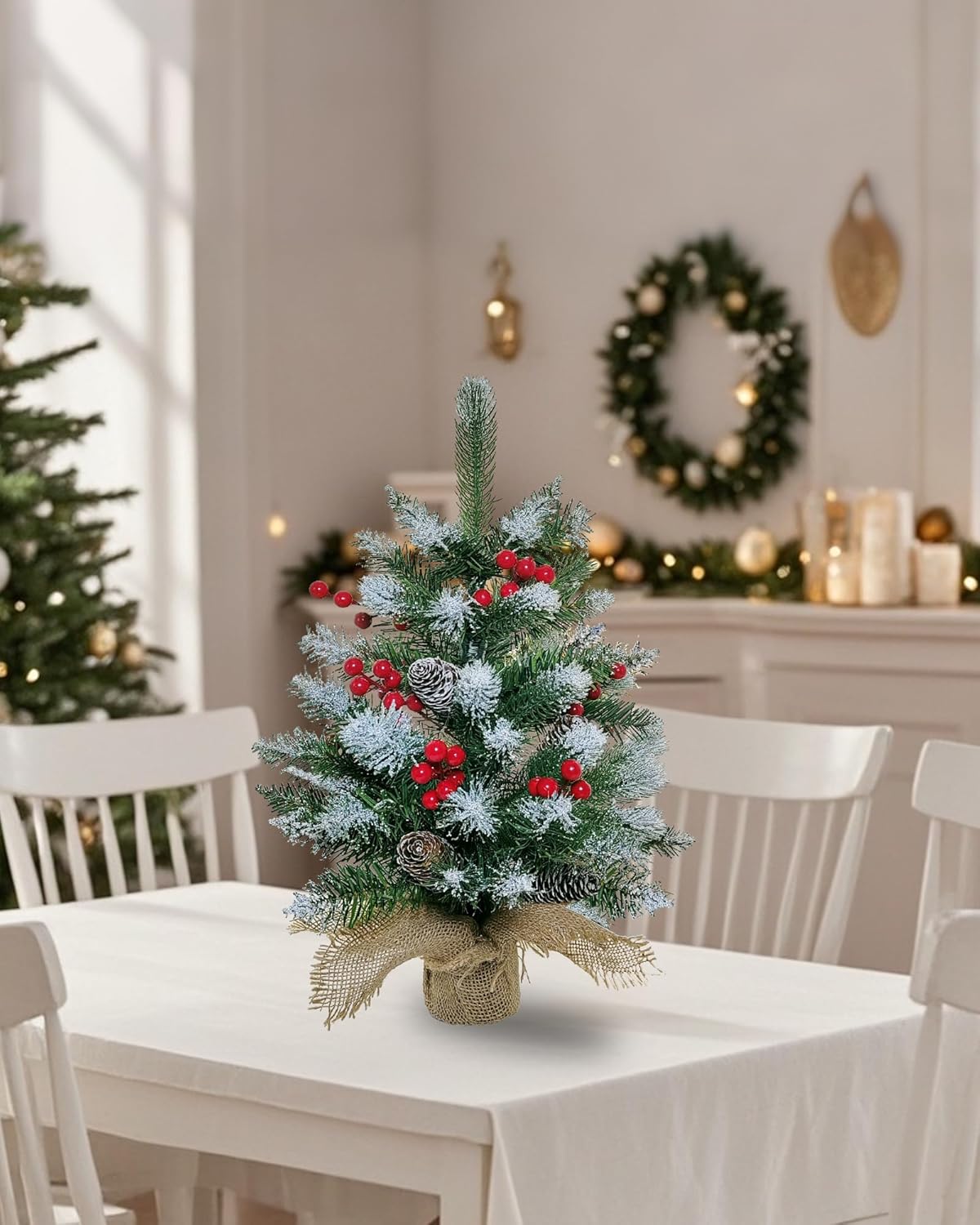 Small Christmas Tree, 22 Inches Artificial Tabletop Christmas Tree with 50 Lights,Snow Flocked Mini Xmas Tree with Pinecones Berries Wood Base for Christmas Decorations Indoor Home Decor