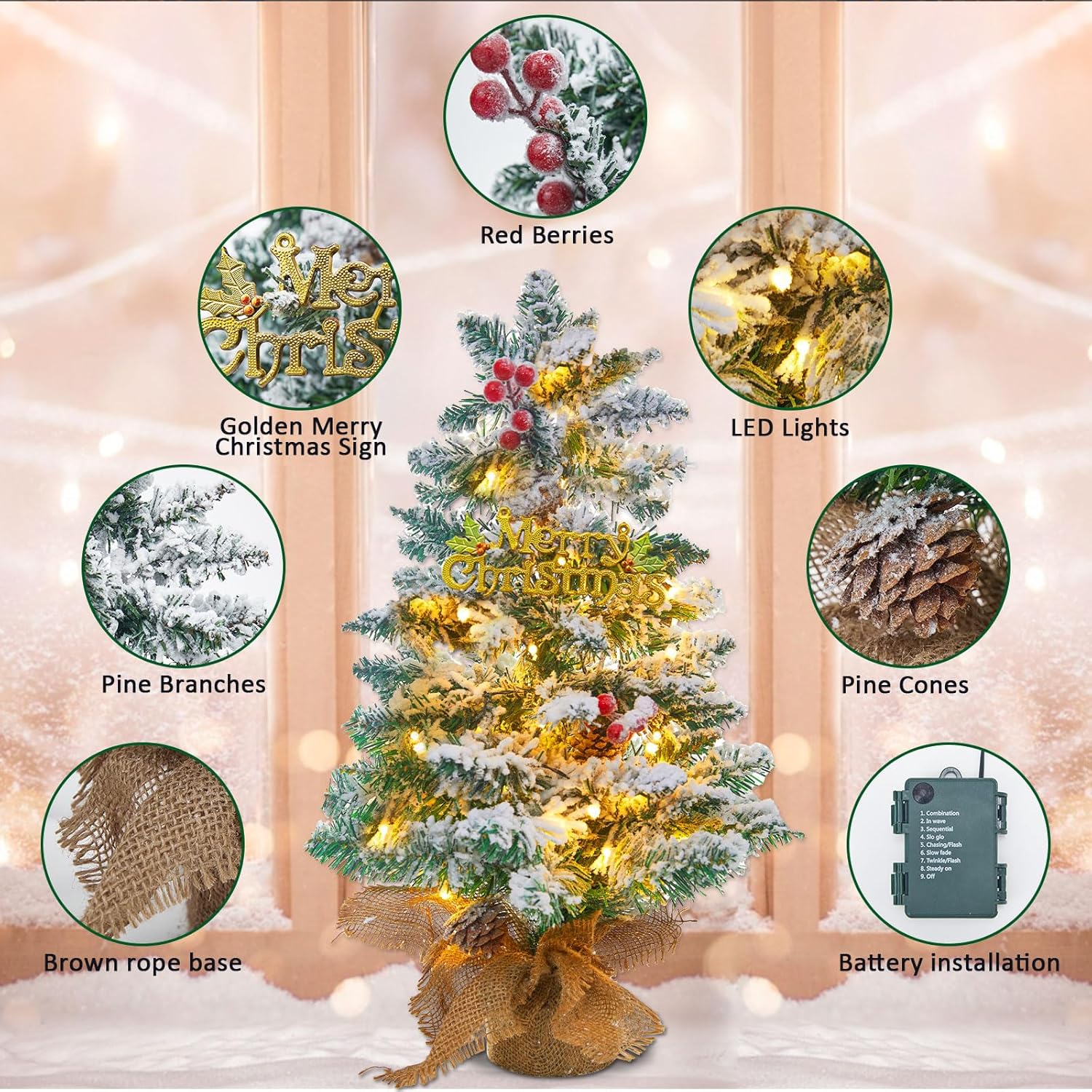 Small Mini Table top Christmas Tree with 50 LED Lights 24 Inch /2FT Little Prelit Christmas Tree Decorated Boxes and Hanging Ornaments for DIY Christmas Decoration (Flocked)
