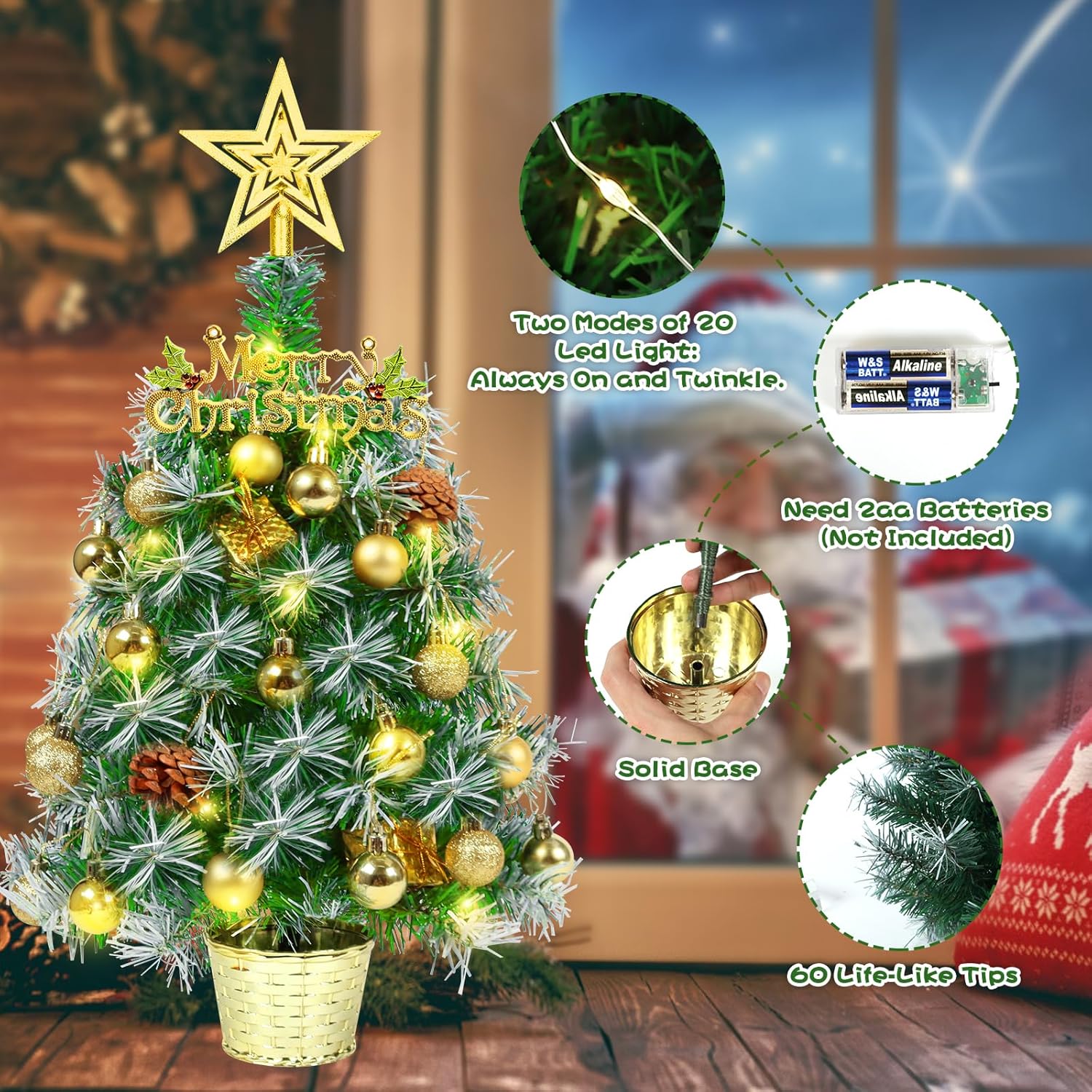 Small Prelit Christmas Tree, 20" Tabletop Mini Xmas Trees, Snow Flocked Battery Operated Tiny Artificial Trees with Lights, Balls Ornaments, Lighted Xmas Decorations for Table Centerpiece