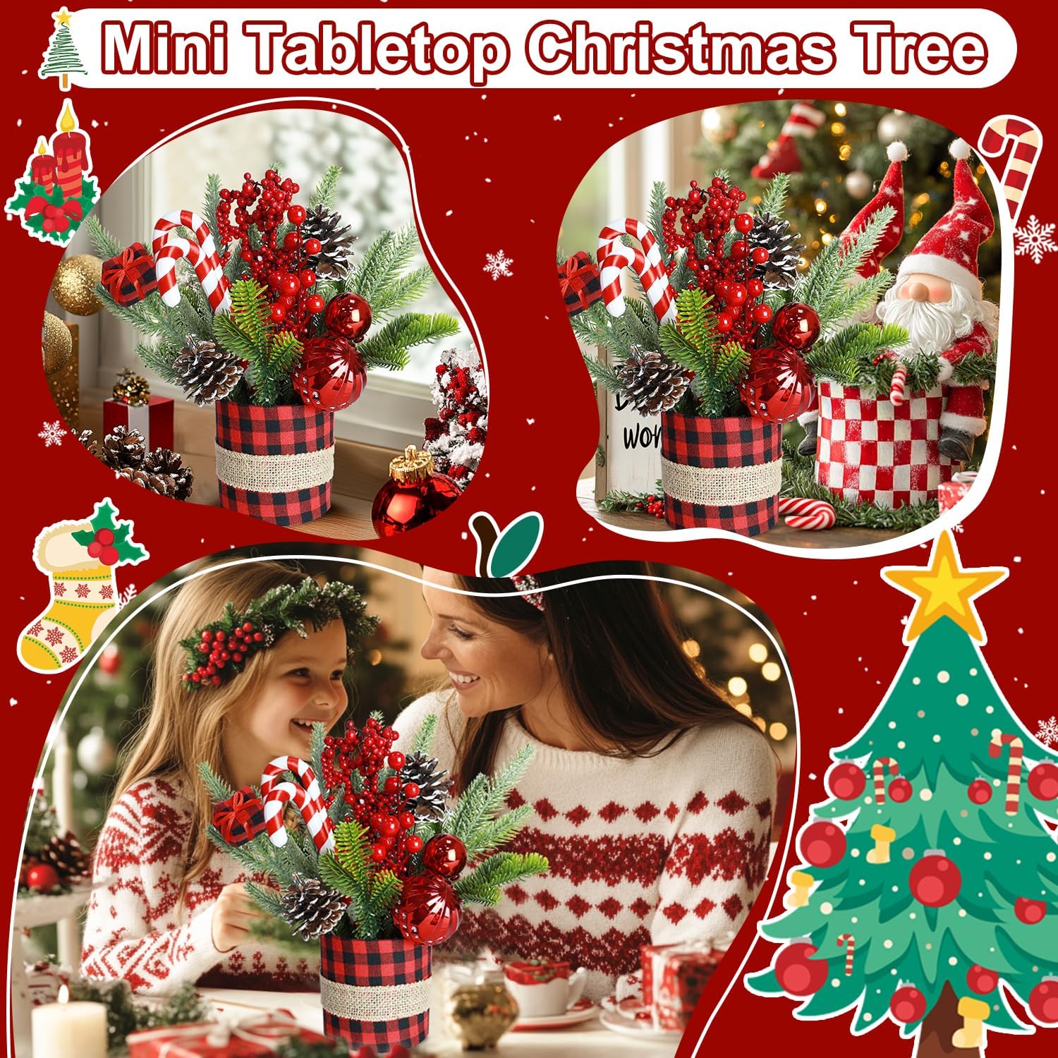 🎄【Size Information - Small Tabletop Christmas Tree】The small Christmas tree measures 3.7" L x 11.4" W x 12" H. The petite stature allows it to shine in tight spaces, whether on desk, shelf, or your dining table, bringing the spirit of Christmas wherever it goes.🎄【Quality Material - Mini Artificial Christmas Tree】The mini christmas tree for desk is made of quality PVC material. With a red plaid base, small table top christmas tree is adorned with 2 candy canes, 2 red linght ball, 2 pine cones, red berry clusters, 1 mini boxes, adding a burst of holiday cheer to your home or workspace.