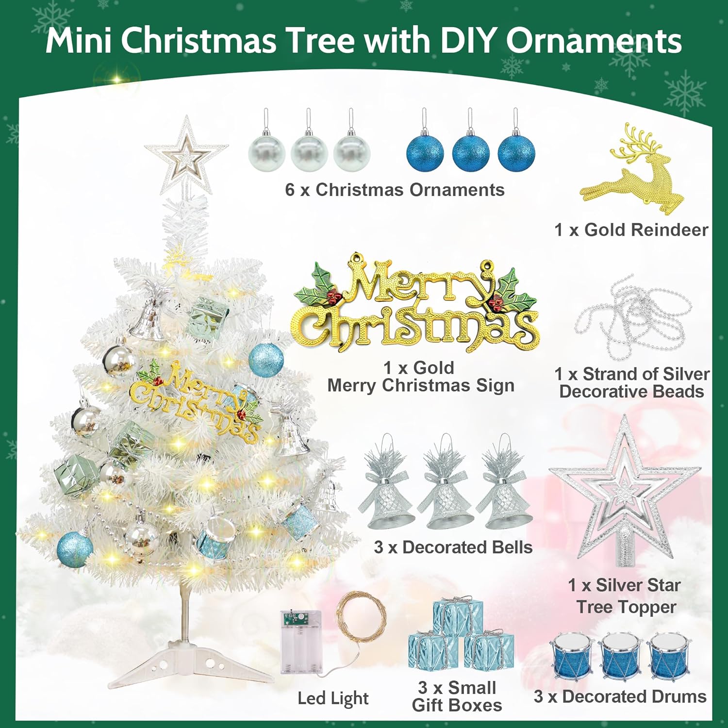 SMALL WHITE CHRISTMAS TREE DECORATIONS INCLUDES: Each set of 2 Ft white mini Christmas tree includes a variety of accessories: 1 pcs Christmas tree white stand, 1 pcs silver star tree topper, 1 pcs "Merry Christmas" decoration, 1 pcs decorative reindeer, 3 pcs small silver Christmas balls, 3 pcs small blue Christmas balls, 3 pcs small boxes, 3 decorated bells, 3 decorated drums, 1 strand of silver decorative beads.WHITE CHRISTMAS TREE: The white Xmas tree is made of high-quality PVC material. The small white Christmas tree conveys a warm and joyful holiday, becoming an essential part of the Christmas season. Wishing you a Christmas filled with joy and warmth.