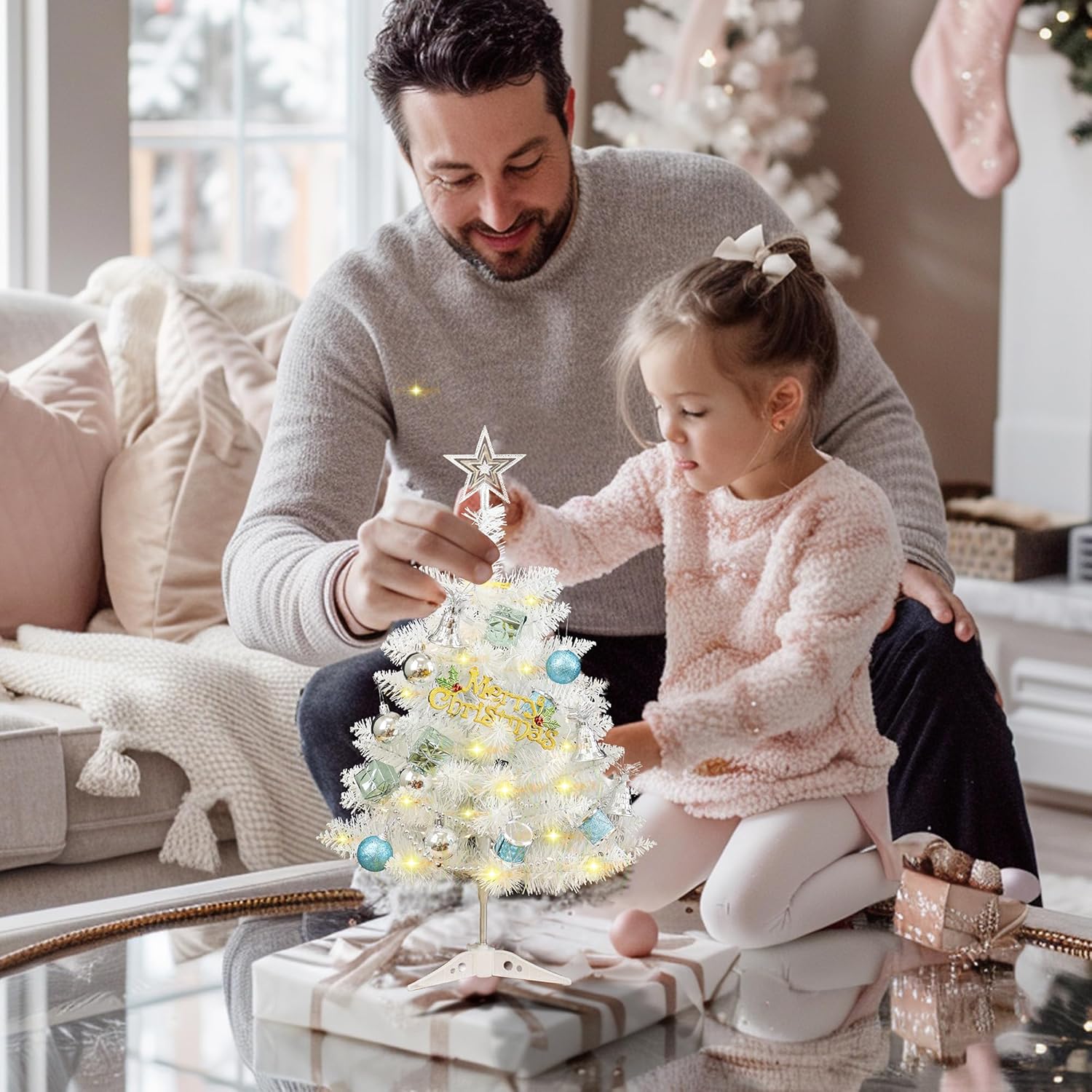 • DIY YOUR WHITE ARTIFICIAL CHRISTMAS TREE ORNAMENTS: To ensure the best effect, you need to gently adjust the branches of the white table top Christmas tree after unpacking to create a full and realistic appearance according to your preferences. The tabletop Christmas tree can increase joy for kids, and interactive fun among family members.