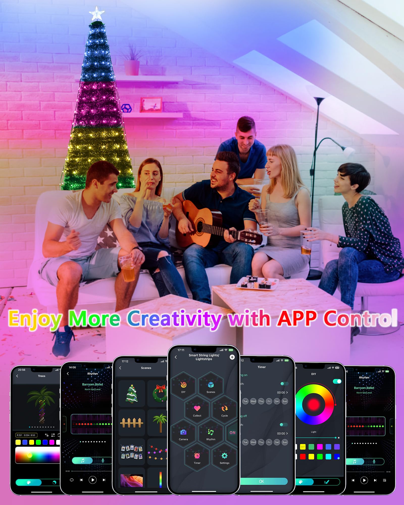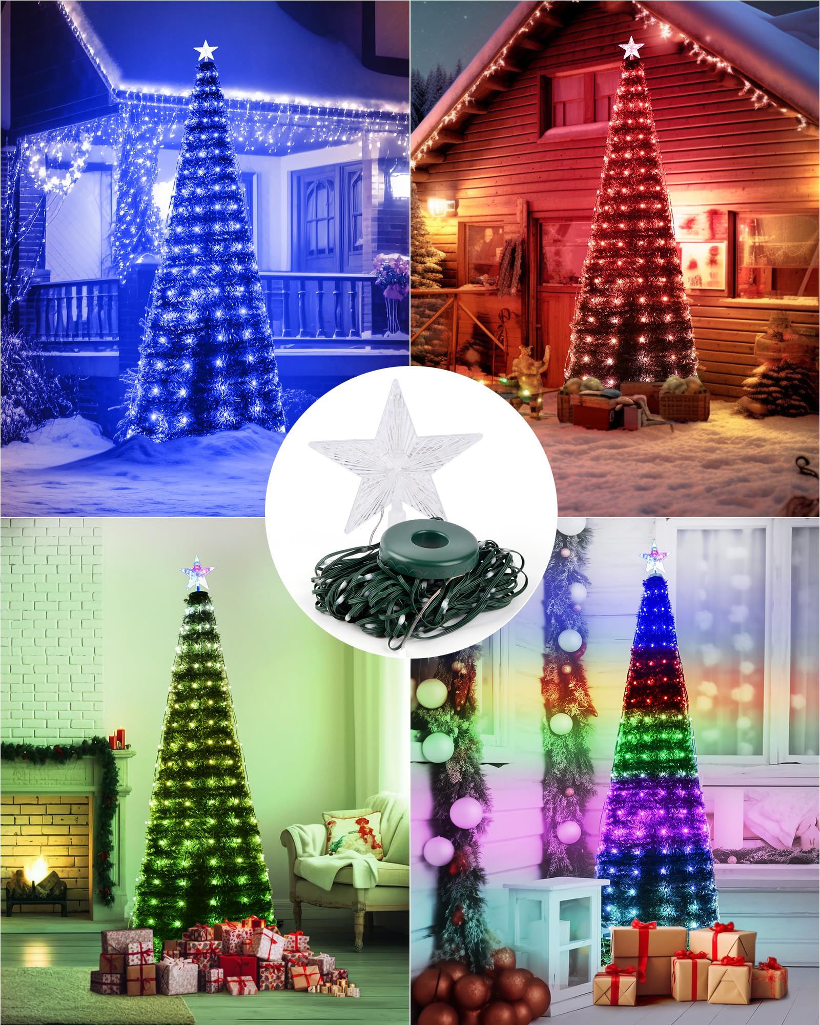 Christmas Tree Lights with Ring & Topper Star: Our smart led Christmas lights indoor include a topper star, attach the star to the top of the xmas tree lights, then effortlessly place the ring over the tree and align the 10 strands. The waterfall lights are designed with 10 strings of light beads, each measuring 6.6ft/2M. The color of the star topper is synchronized with the app controlled christmas lights. It can be separated with outdoor led christmas lights. You can disassemble them and use another star topper Smart APP & Remote Control: Our multicolor Christmas tree lights with remote can be controlled by APP, remote control and button on the Christmas tree fairy lights. One-step APP connection gives you more advanced control: 16 dimmable million lighting colors and warm white color options, more Choices of dynamic effects, brightness & speed adjustment, music lighting effects, custom timing functions and more. Decorate your home with this impressive holiday lighting effect