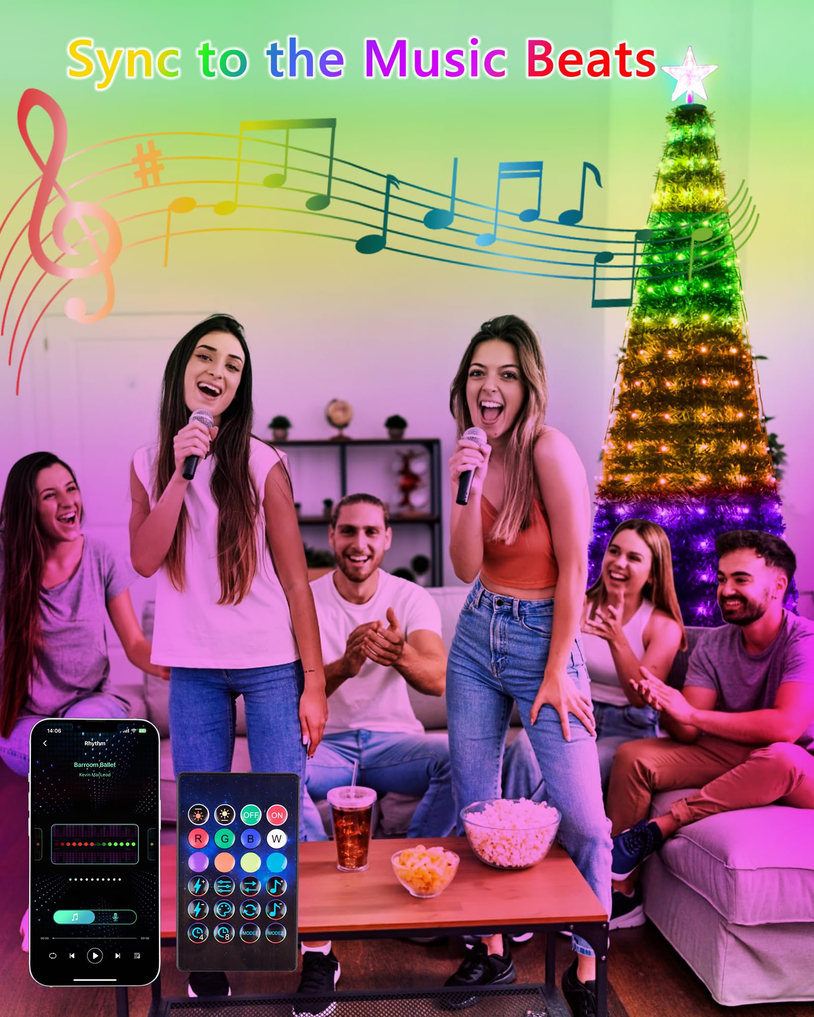• Christmas Lights Music Sync: Built in a sensitive mic, the Christmas tree string lights can react effortlessly to the sounds of audio and keep pace with every beat of your favorite music. christmas lights to music kit get active during intense parts of a song and magically change colors at just the right moment. These vibrant and colorful lights are the perfect decoration for Christmas tree, halloween, thanksgiving, garden, patio, birthday, gathering, wedding, and Christmas parties, adding a fun and lively atmosphere to any occasion