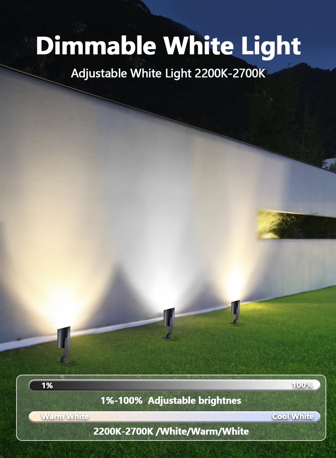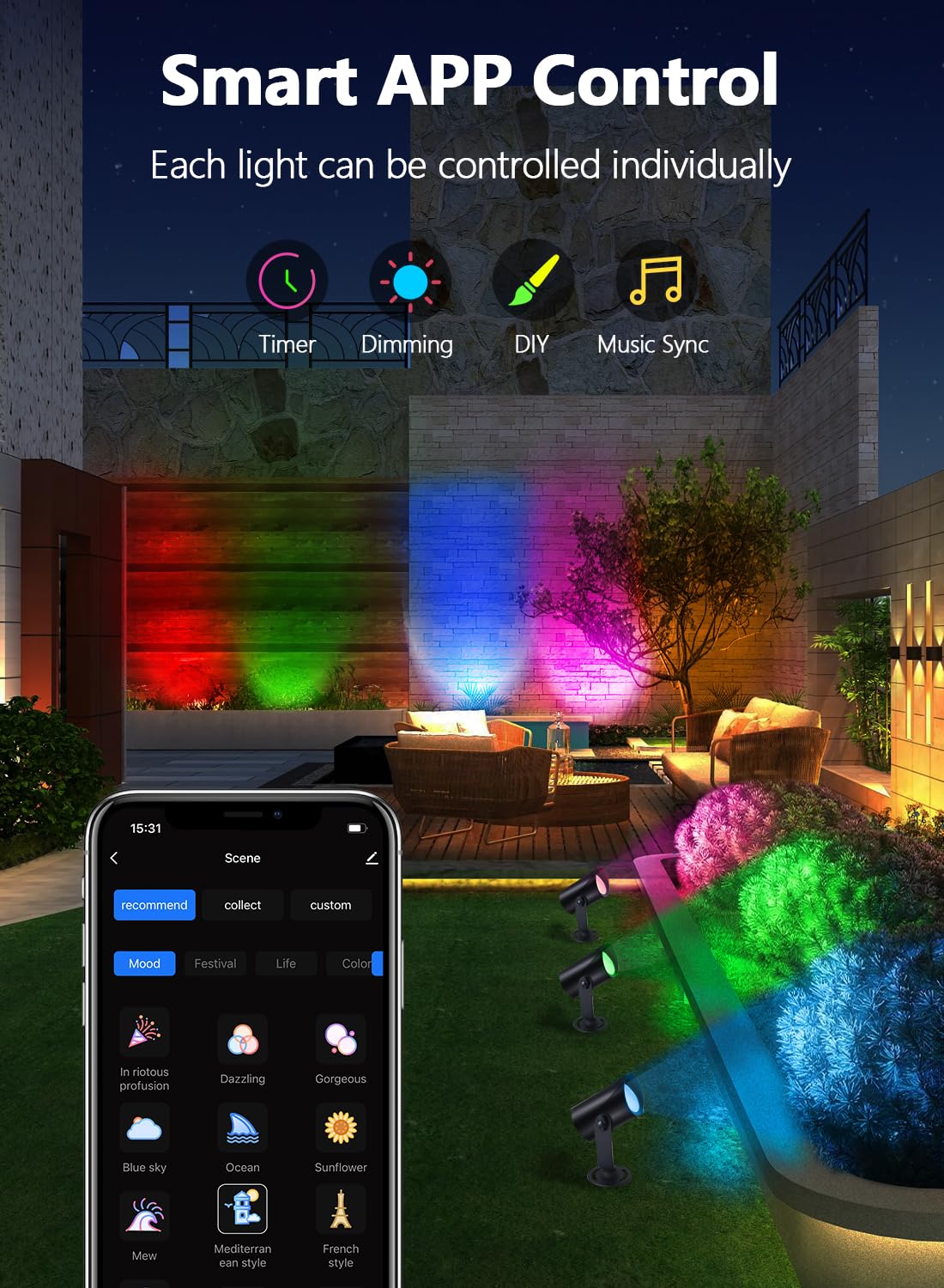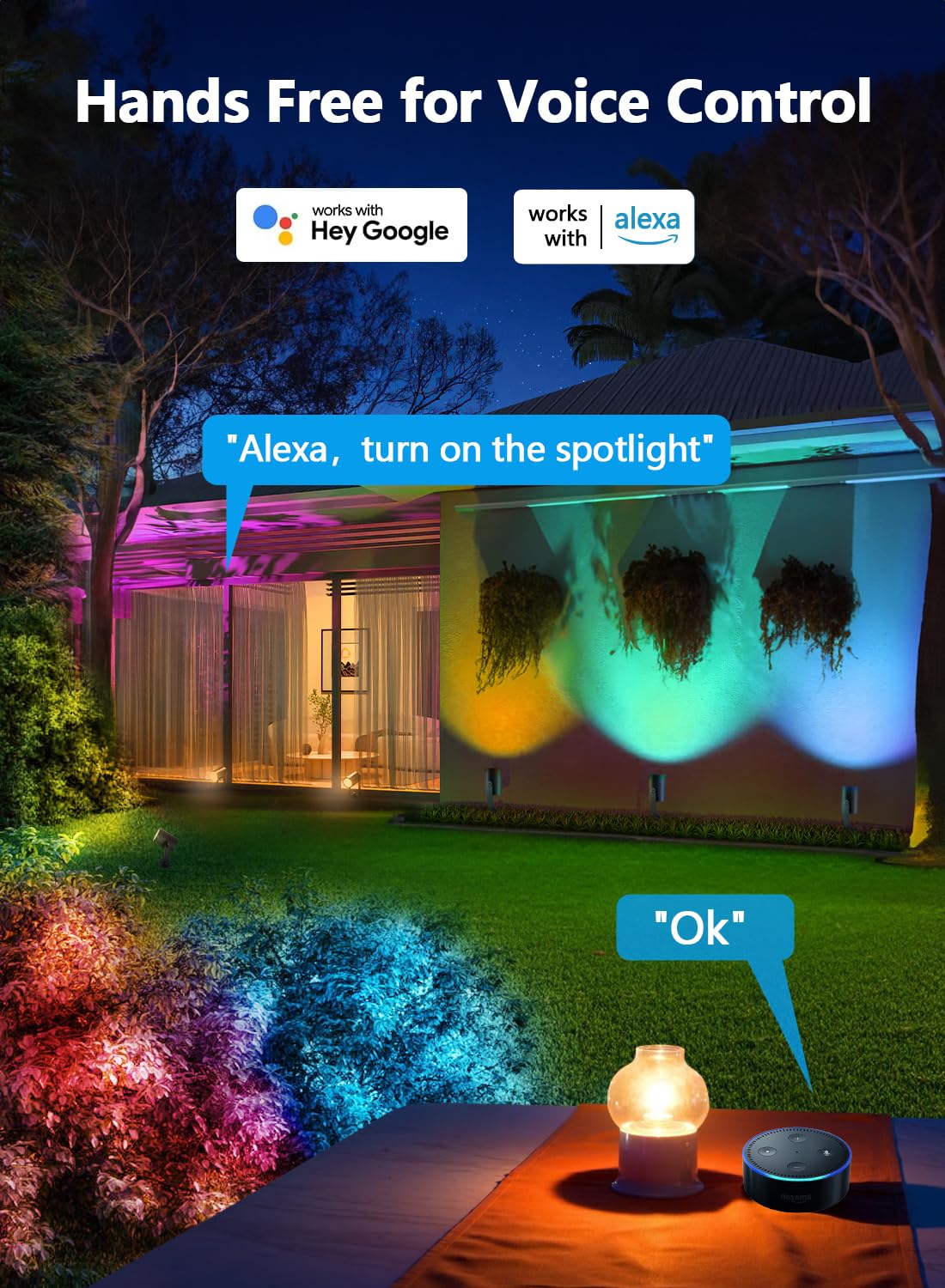 Smart Landscape Lighting, IP67 Waterproof Landscape Spotlights, 3000LM Dimmable RGBICW Pathway Lights Work with Alexa, Spot Lights for Christmas Outdoor Decoration, 4 Pack