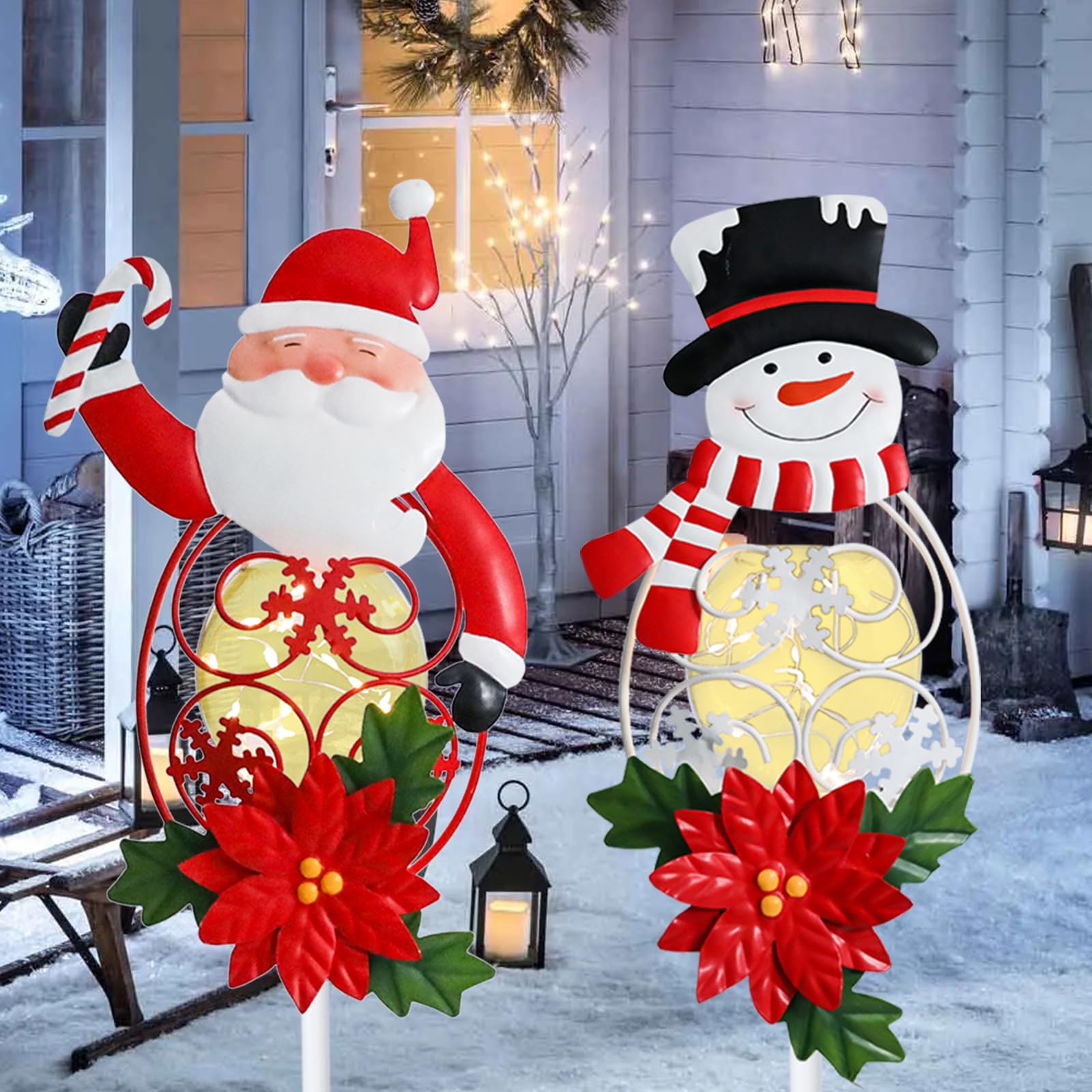 Solar Christmas Garden Stakes 2 Packs Santa and Snowman Christmas Metal Yard Stakes with LED Lights Waterproof Xmas Outdoor Decorations for Garden Lawn Pathway