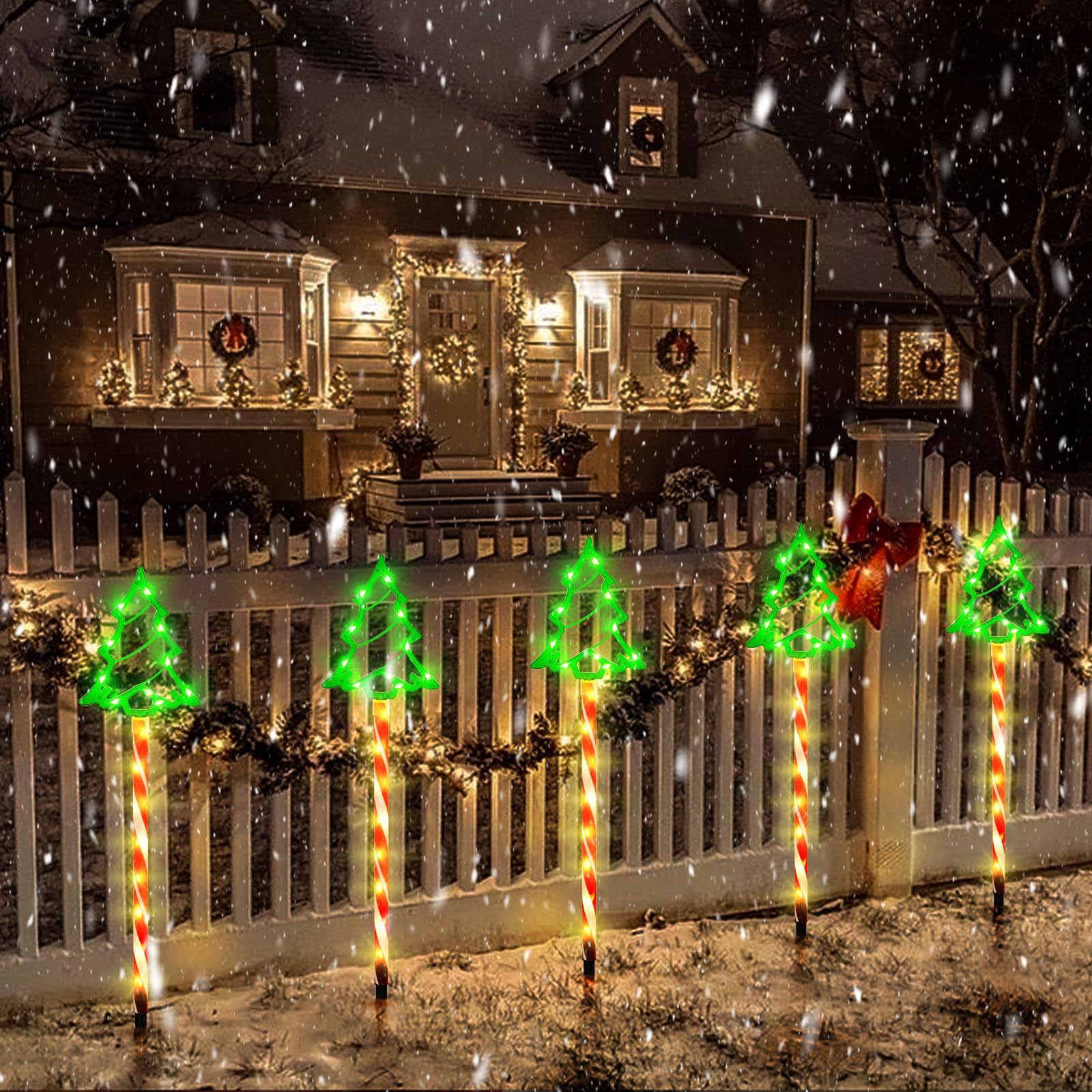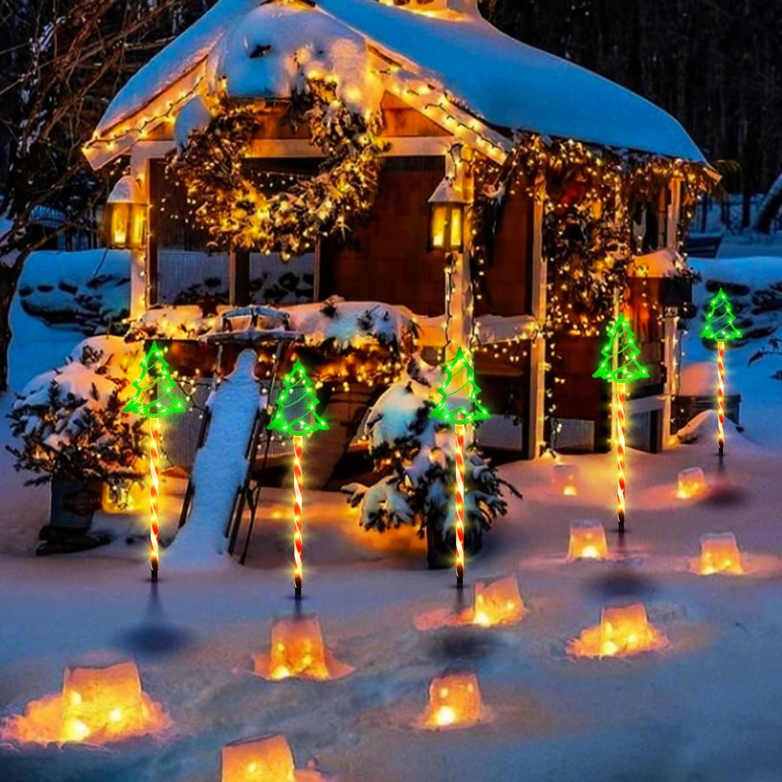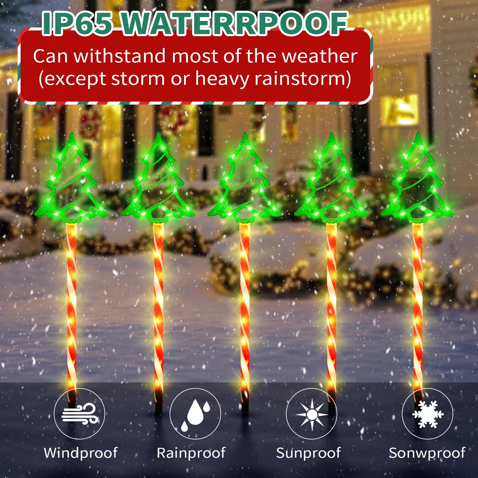 D SOLAR CHRISTMAS TREE: You will get a set of 5 solar christmas lights outdoor waterproof decorations, each Christmas tree is 7.9x6.3in and the pole is 20in( with stake ). The spacing between each Christmas tree is 1.6ft, and the lead wire is 6.5ft. You can place these solar Christmas tree outdoor in flower beds, lawns, or porches, add more Christmas atmosphere to your yard. 8 LIGHTING MODES & IP65 WATERPROOF: 8 Modes include combination, in wave, sequential, slo glo, chasing/flash, slow fade, twinkle/flash, and steady on, meeting your different Christmas lights outdoor decorations needs. IP65 waterproof Christmas pathway lights outdoor trees are safe to use outdoors even in rainy or snowy conditions.