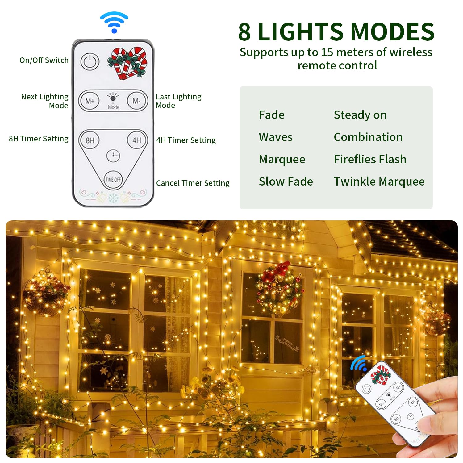 β’ [REMOTE CONTROL - 8 LIGHTING MODES] These Green Line Christmas Tree Lights have 8 different lighting modes to suit different occasions and moods. Steady On, Wave, Sequential, Slo-Glo, Chase/Twinkle, Slow Fade, Twinkle/Twinkle and Combination.