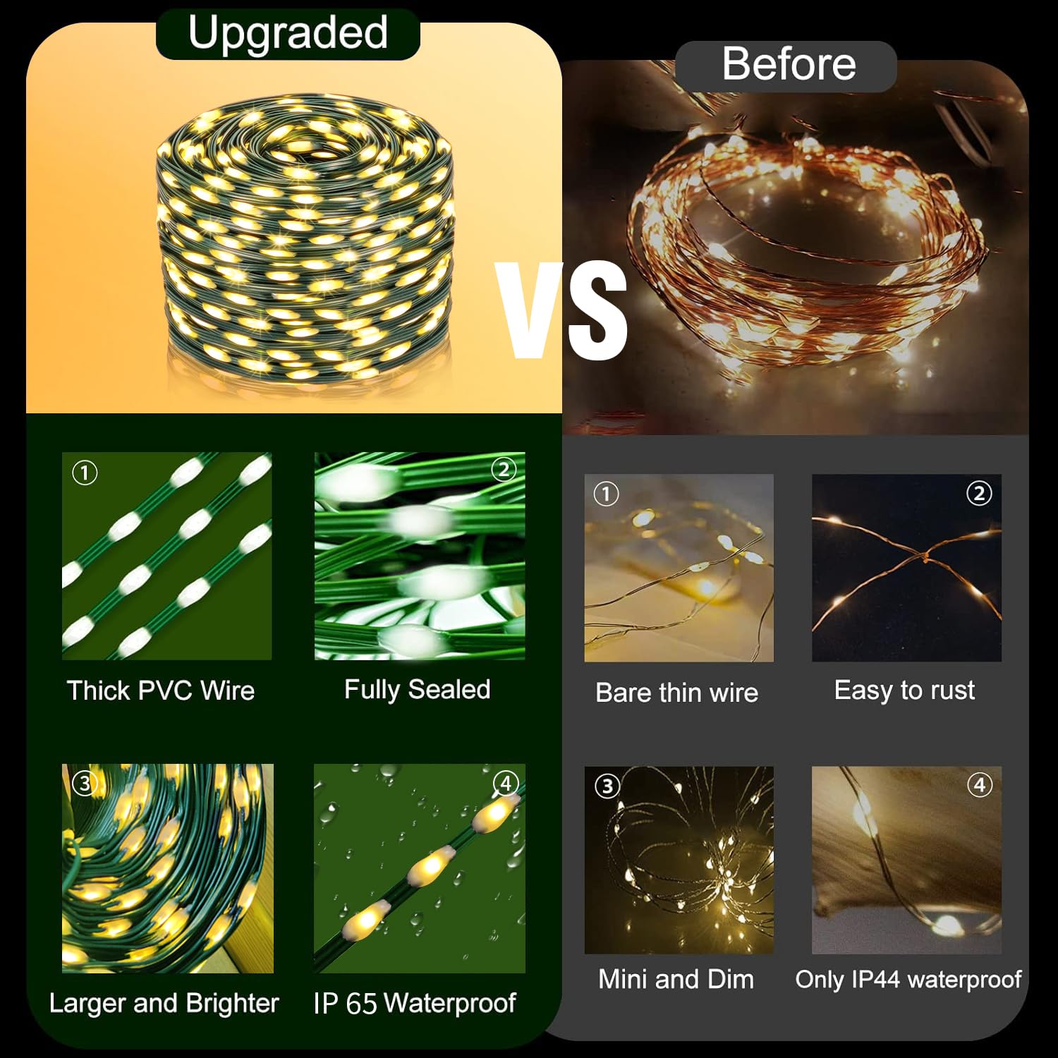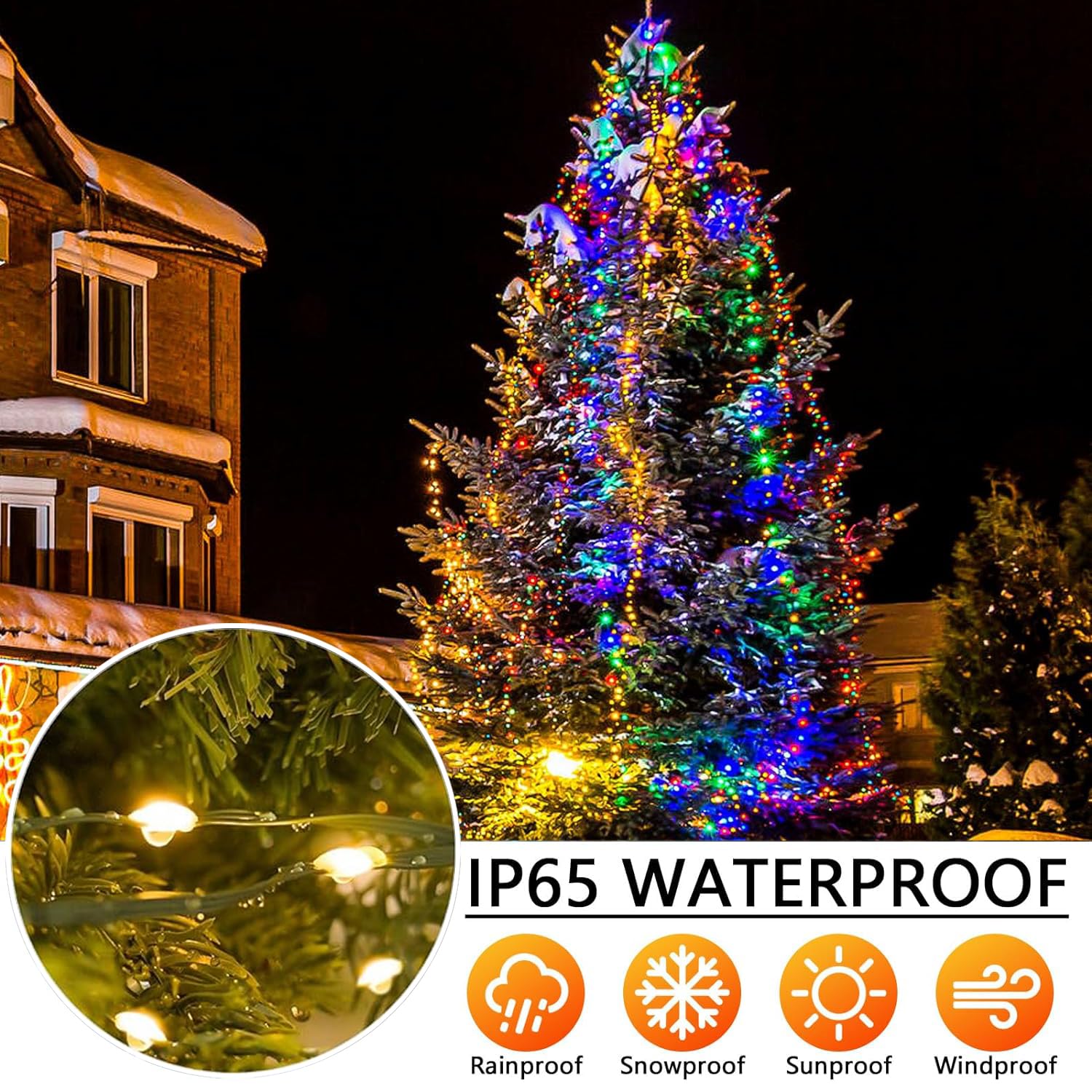 [PERFECT HIGH QUALITY DESIGN] The LED beads of these Solar Christmas lights are very neatly set on the cables, which won't look messy compared to traditional lights. These extra long (196 feet and extra 6.5 feet extension cord) Solar Christmas light are not only very bright when decorating, but also compact and easy to store. [DURABLE PVC & WATERPROOF DESIGN]: Made of high quality ABS and PVC material wires, these Solar Christmas light are more durable and the high quality material prevents from twisting or breaking in harsh conditions. In addition, our solar Christmas lights are IP65 waterproof rated and each LED bulb is designed with a waterproof seal, which allows them to be used both indoors and outdoors even in rain, snow, or stormy days.