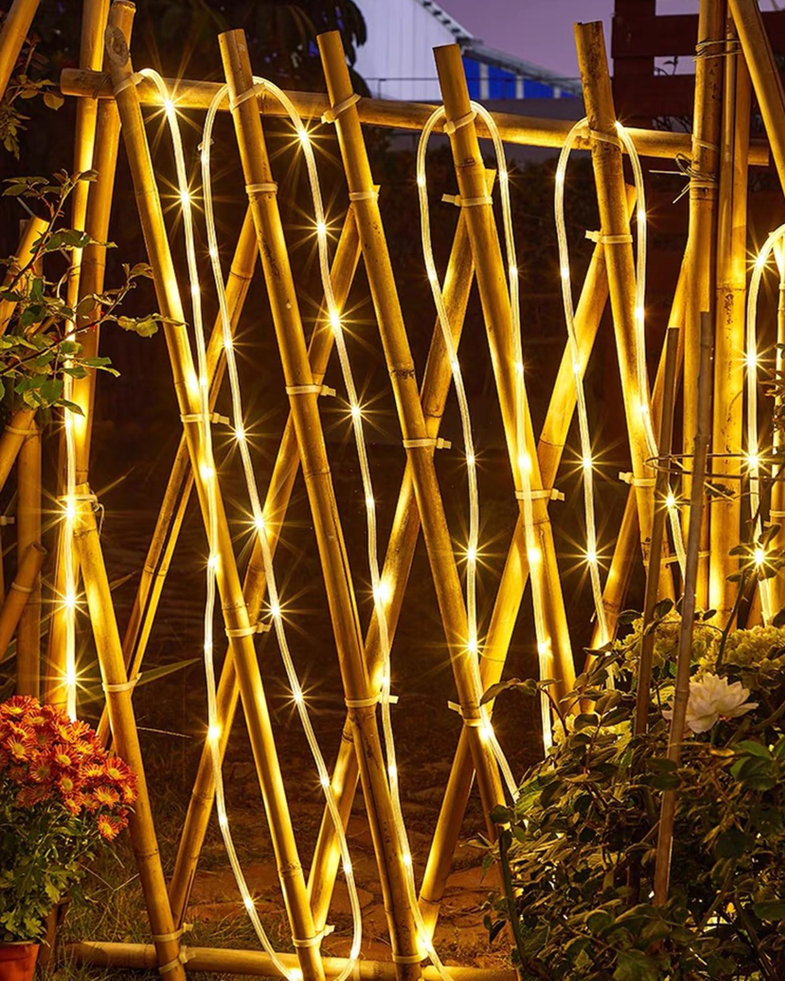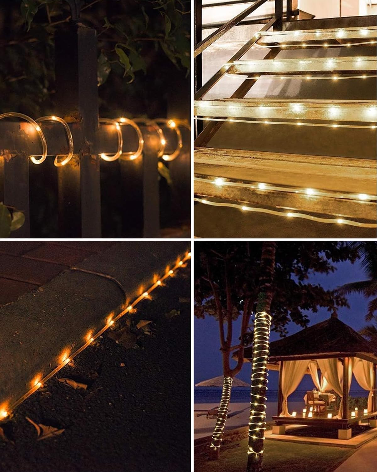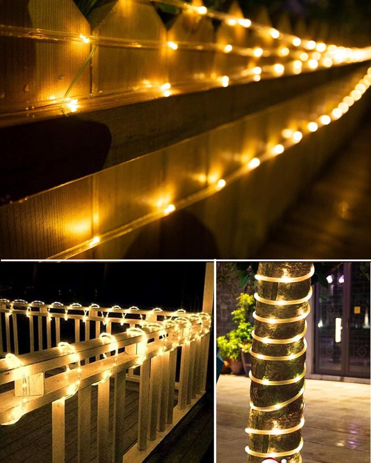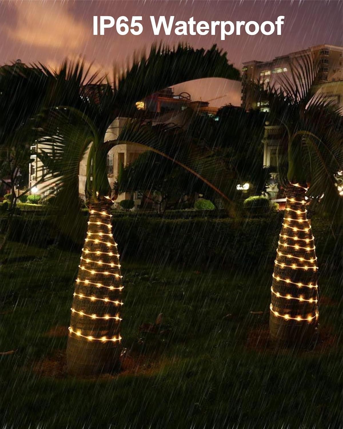 β’ Tube Rope Lights Waterproof: This solar rope light uses thick transparent plastic tube, which have strong elasticity, UV resistance, safety and durability, and good waterproof performance. It can reach IP65 waterproof rating, and have high temperature resistance, snow and frost resistance. The tube lights is designed to withstand light rain or water spills,which makes them perfect for an outdoor decorations
