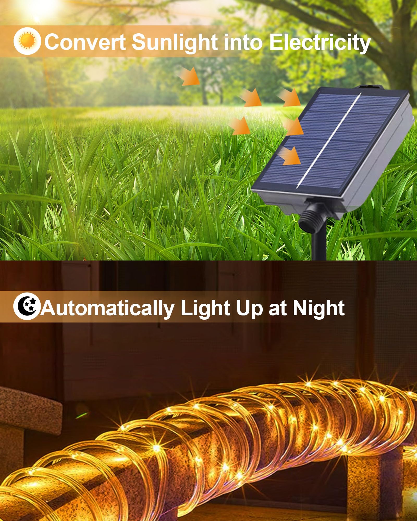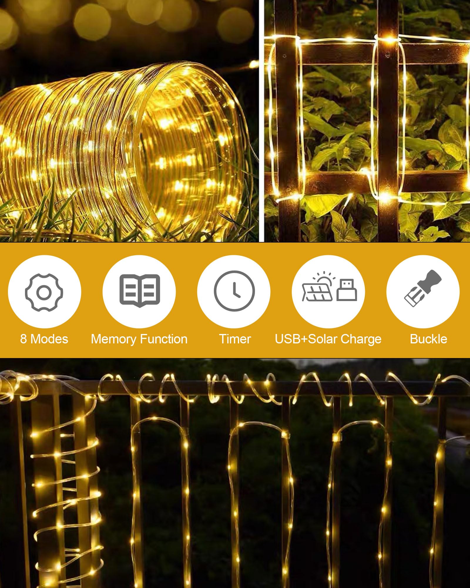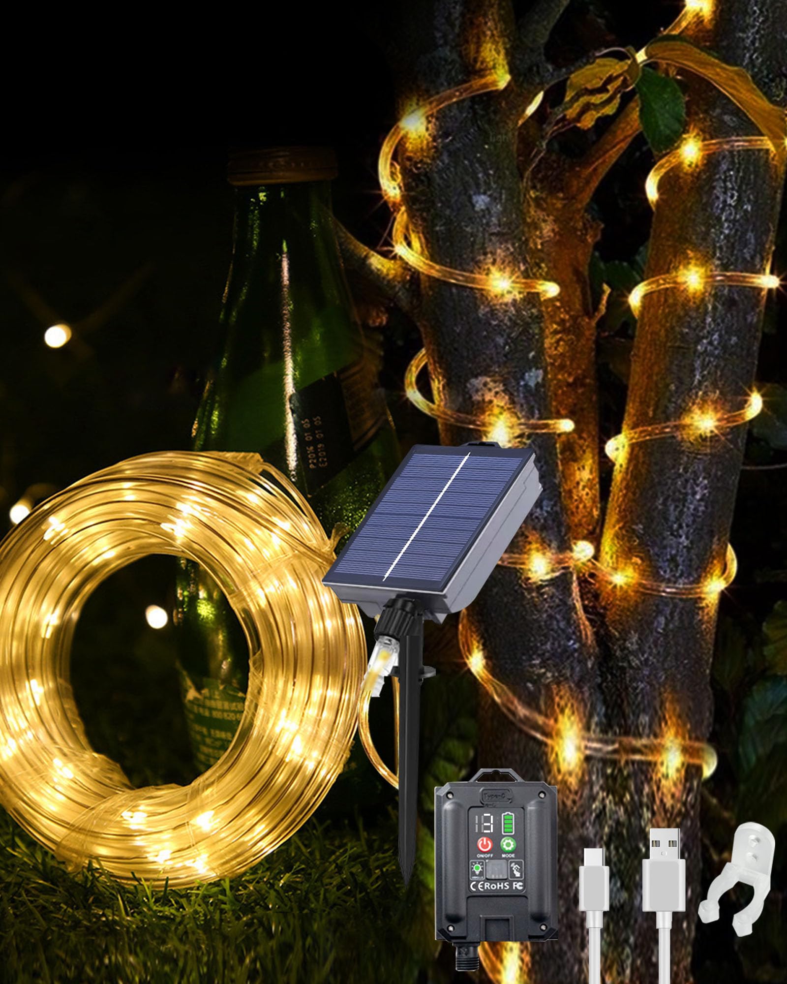 Solar and USB Charging Options: Solar tube lights designed with rechargeable USB port solar panel, solar fairy lights can work continuously for 8-15 hours at least if the panel absorbs enough sunshine during day, it will light up at night automatically. And the USB charging can be complementary when there is no sufficient sunlight during the day, which greatly meets your needs for brightness effect and lighting duration Indoor and Outdoor Wide Application: The solar rope lights are very flexible and long for 66Ft, it can be bent into any shape that can meet your different needs of decoration. The solar rope lights can be used to provide beautiful lighting for any outdoor & indoor occasions such as patio, garden party, wedding, tree, patio, home, bedroom, window, bathroom, yard, patios, fence etc. Creating a romantic fairy kingdom belong to you with solar fairy lights