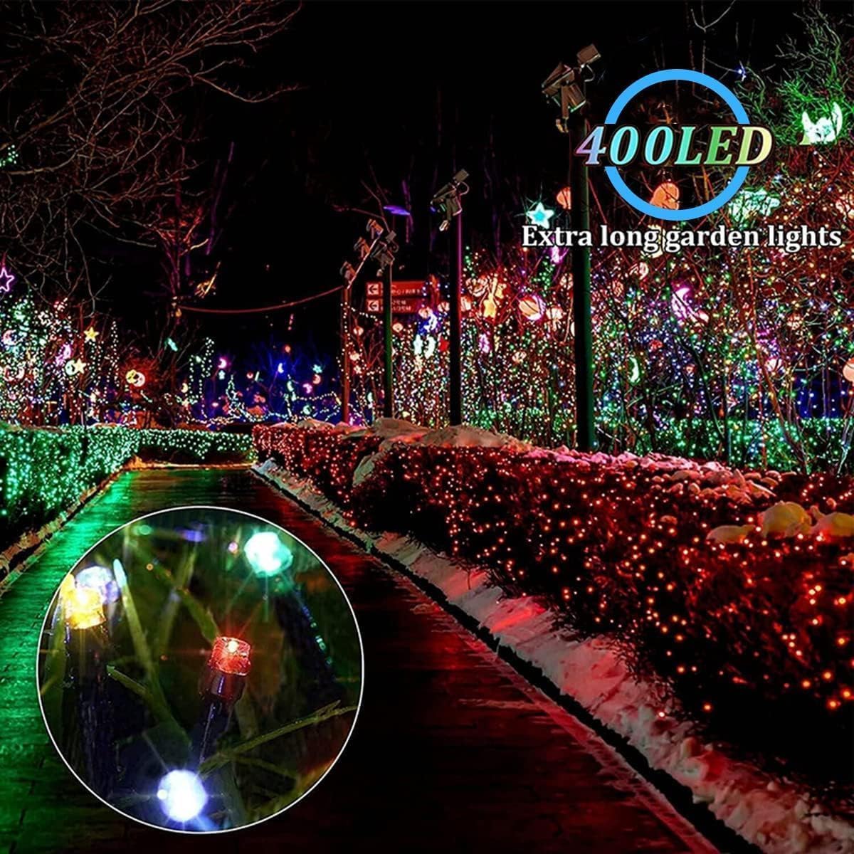 Multicolor 400 LED Solar Christmas Light: Create a stunning atmosphere both day and night with our solar-powered outdoor string lights. Brighter LED string lights,which have 19 modes. Plus, with d light sensors and IP65 waterproofing, it's designed to last all night long, rain or shine. Variable Lighting Modes for Different Atmospheres:The solar Christmas light string has 19 different lighting modes, which can be adjusted by the remote control panel or the "Mode" button on the back of the solar panel. The built-in memory chip has a memory function, every time you turn it on or when night comes, it will automatically adopt the mode that was set for you last time. You can adjust to the most suitable lighting mode according to your decorative needs or different situations.