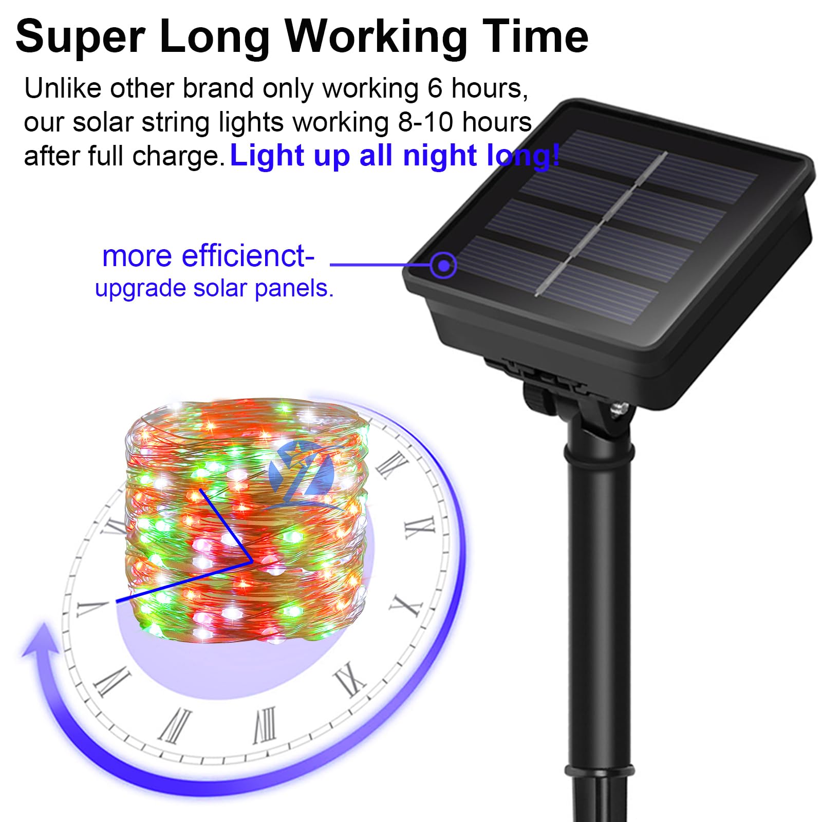 【Christmas Solar Lights】2Pack Each 100 LED bulbs Red White Green Christmas String lights,same color as poinsettia, snow,Christmas tree.Glowing a 360 degrees charming warm light, add a soft and warm festival glow to your home. 【8 Different Lighting Modes】YAOZHOU Christmas lights has 8 different lighting methods for you to choose, including combination, in wave, sequential, slo-glo, chasing/flash, slow fade, twinkle/flash, and steady on. Press the MODE button on the solar panel till the mode you like.