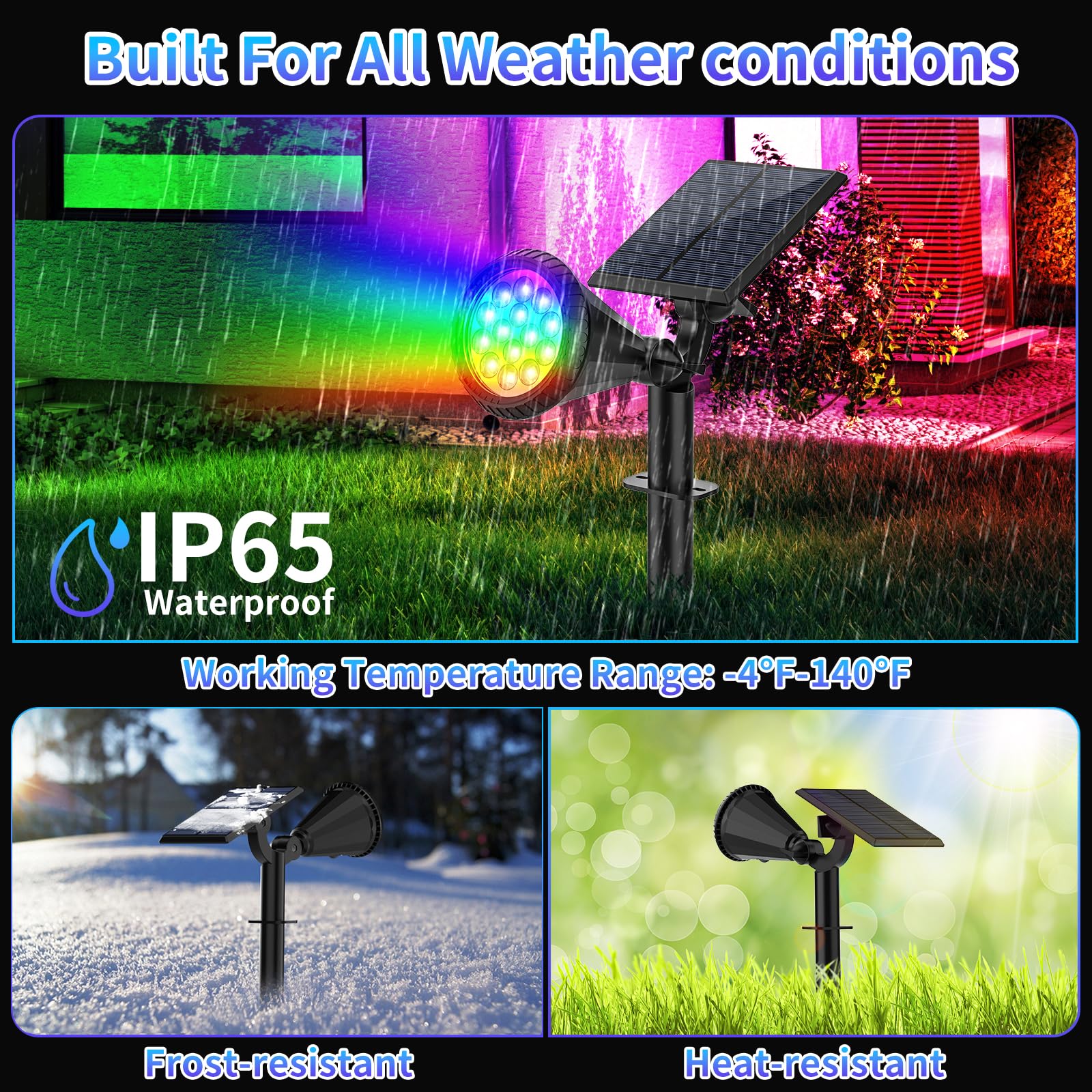 • High Quality & IP65 Waterproof : The solar colored spotlights are made of durable ABS material. IP65 waterproof solar spotlights withstand all types of harsh weather such as rain, snow, wind and frost, high temperatures, etc. The working temperature is from -4℉ to 140℉ and you can place these solar lights outdoor anywhere. Our solar spotlights provides excellent results for outdoor lighting from dusk to dawn