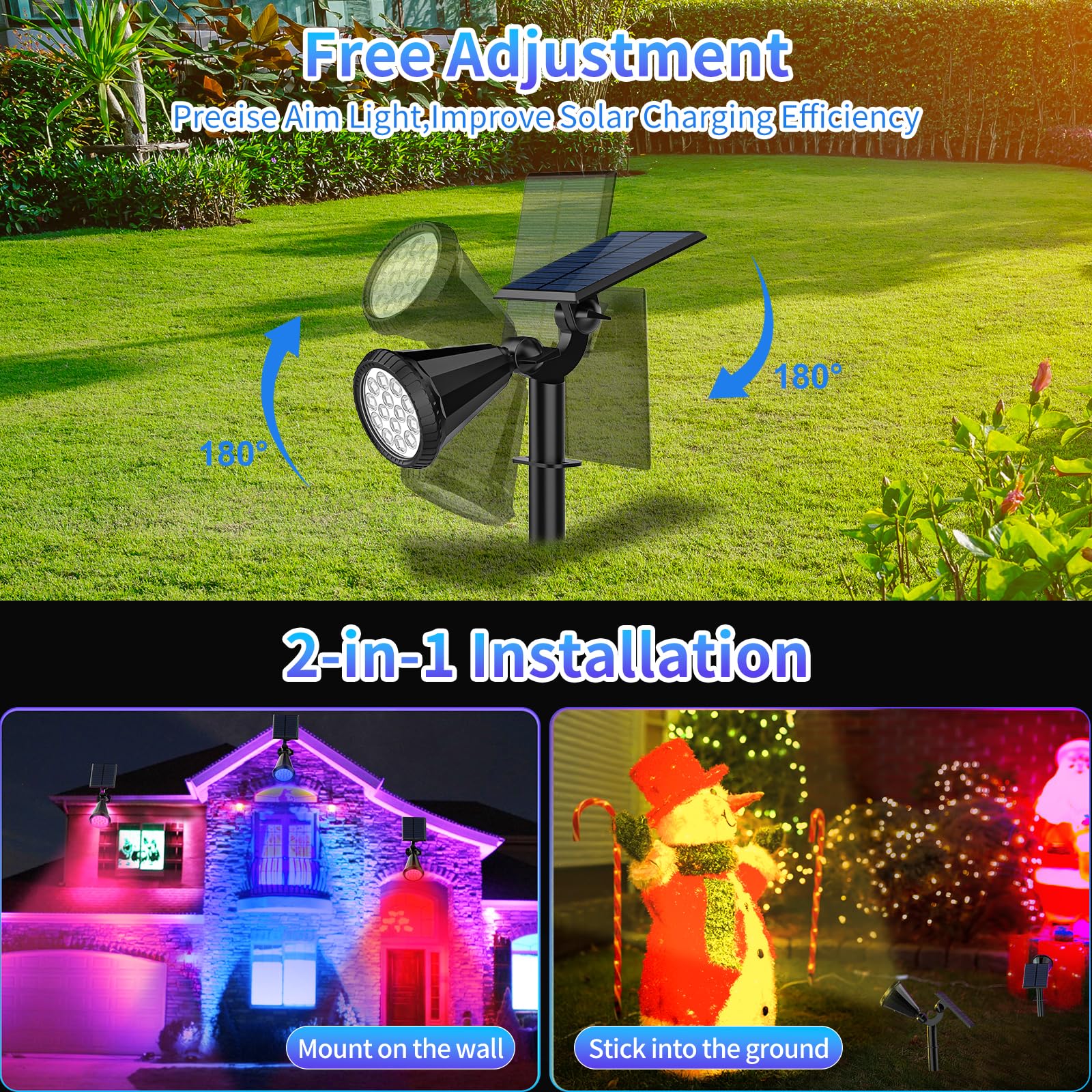 Adjustable Solar Spotlights: Our solar multicolor spotlights provide flexible lighting with adjustable angles.The spotlight and solar panel can independently rotate 180 degrees up and down, allowing you to optimize solar energy capture and achieve the perfect lighting angle. The solar energy conversion rate is up to 25% by using the monocrystalline silicon solar panels, highly reducing the charging time 7 Multi-Colored: With the push of a button, our solar garden spotlights outdoor can easily switch between 7 lighting modes. [1st Mode: Red, 2nd Mode: Blue, 3rd Mode: Green, 4th Mode: Puple, 5th Mode: Cool White, 6th Mode: Lemon Yellow, 7th Mode: Auto Multicolor Changing.] Multiple color modes are perfect for different scene lighting and holiday decorations such as Halloween and Christmas