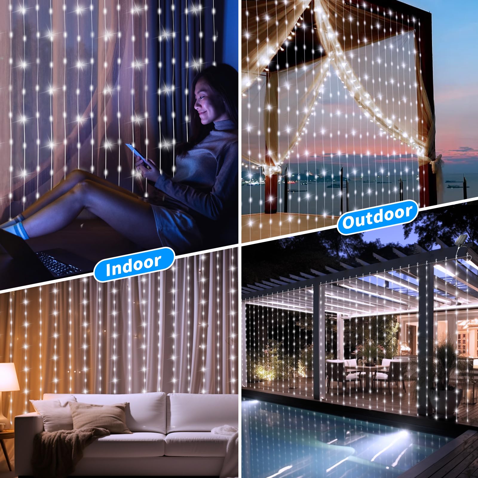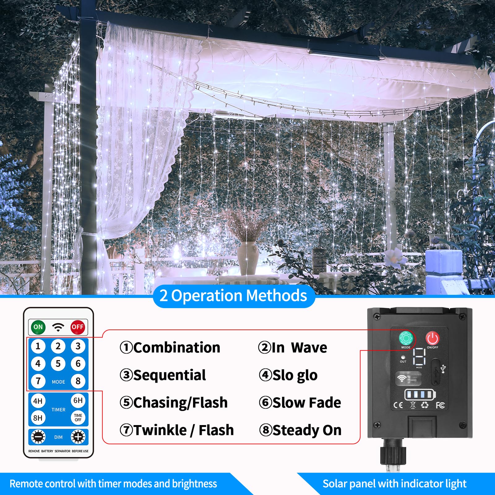 Solar Curtain Lights 1010Ft 300LED Waterproof Waterfall Light with 8 Modes Remote Type C Charging Dimmable Timer Twinkle Fairy String Lights for Outdoor Christmas Gazebo Wedding Party Pergola Patio