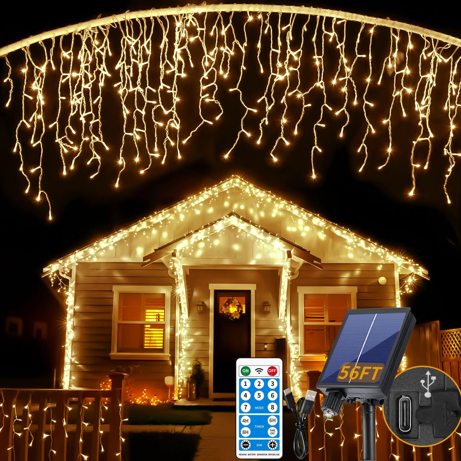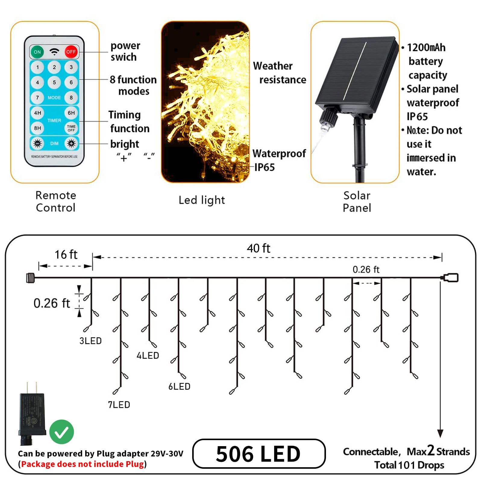 Solar Icicle Lights Outdoor Decorations - 56Ft 506 LED Icicle Christmas Lights Outdoor Waterproof with Remote, 8 Modes Warm Icicle String Lights with 101 Drops for Fireplace Wedding Porch Decor