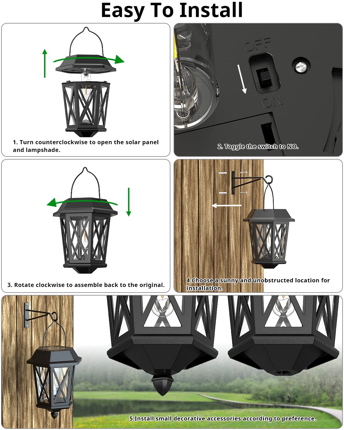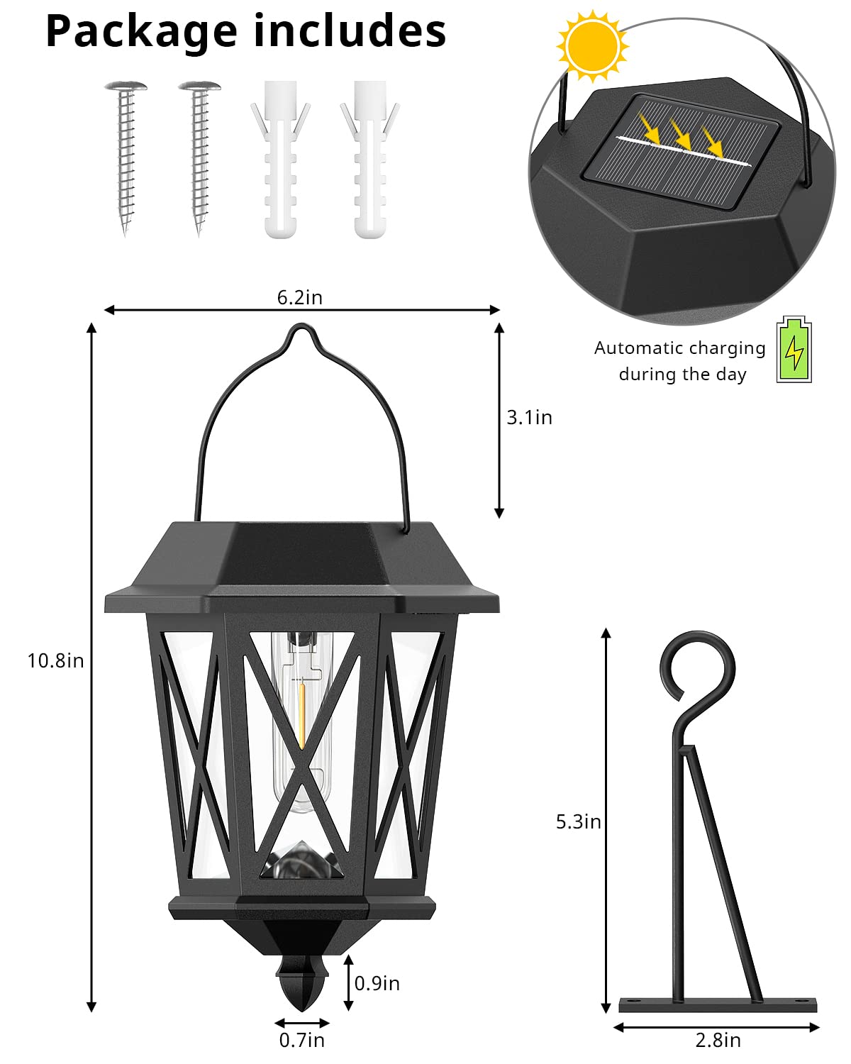 Solar Lantern Outdoor Hanging Solar Lights, Waterproof Metal Solar Lights Outdoor with Clear Glass, LED Solar Powered Lights Wall Mount for Yard Garden Wall Outdoor, Black - 2 Pack