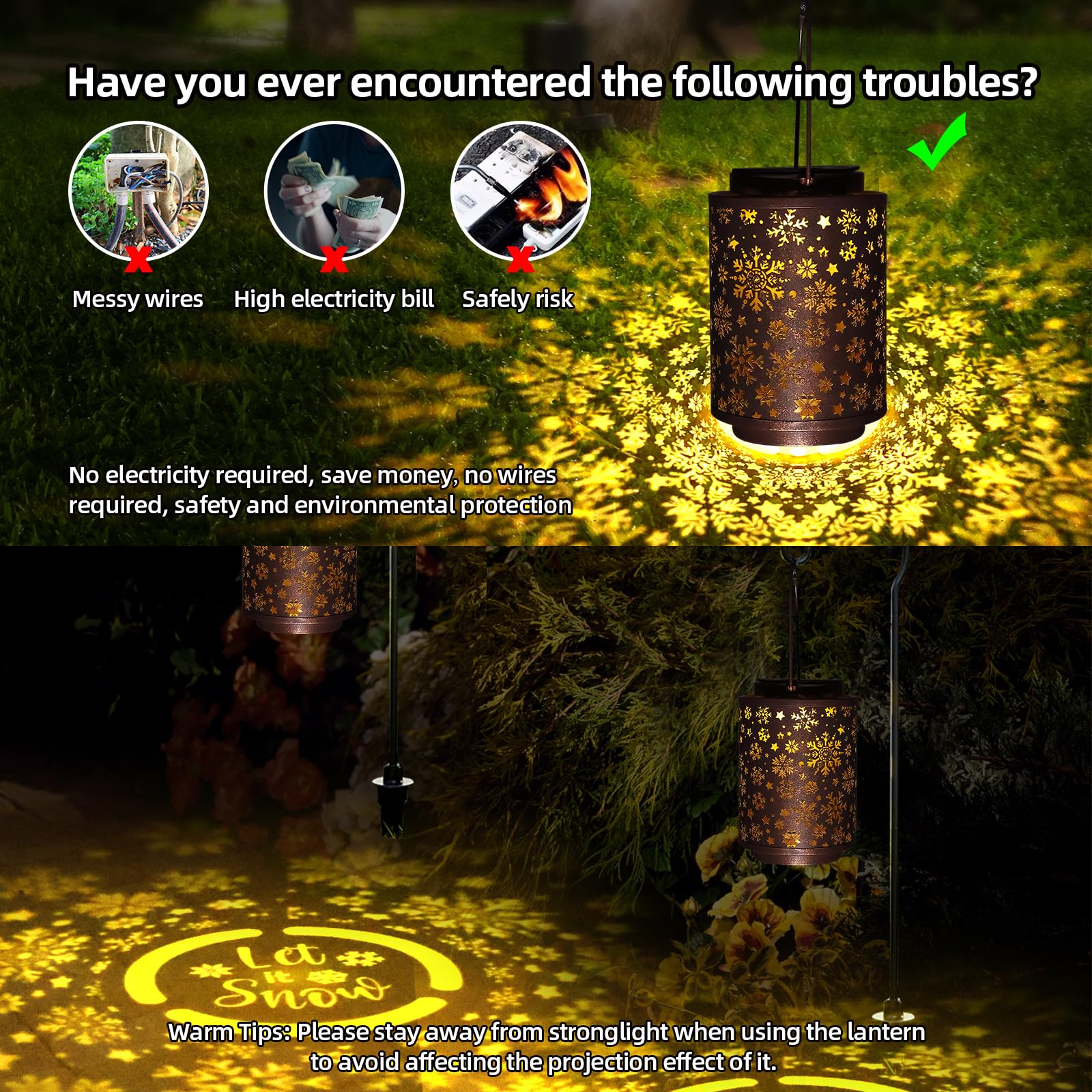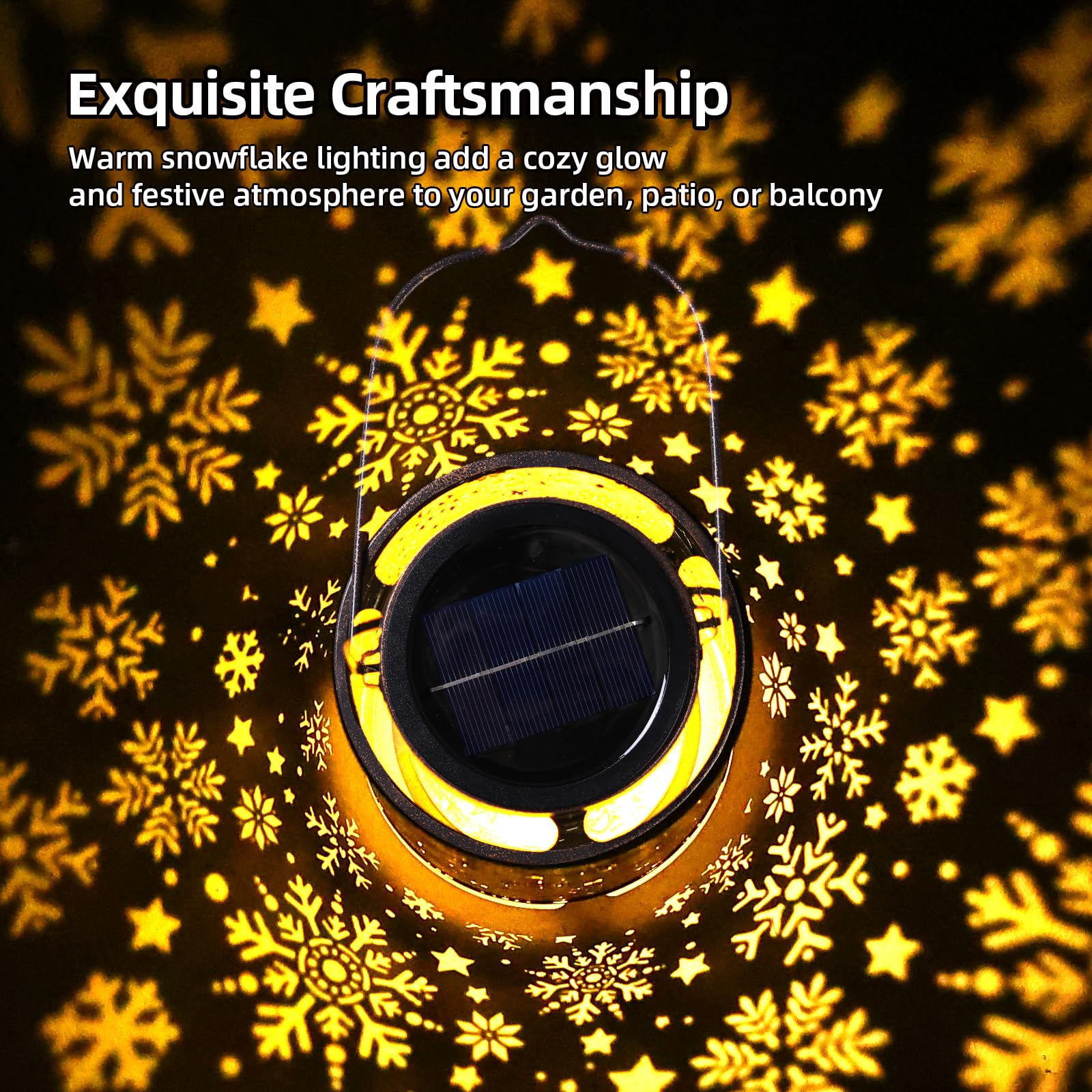 Sophisticated Snowflake Design: With a vintage copper color appearance and a hollowed-out snowflake pattern, this solar lantern makes for a perfect addition to your garden decor or patio decor. It radiates a warm, soft glow at night, enhancing the atmosphere with a magical Christmas holiday mood. Whether used as outdoor solar lanterns or lanterns decorative outdoor, these lights add charm to any setting Stable and Durable: These solar lanterns outdoor waterproof are equipped with d, high-efficiency solar panels, ensuring they charge for 6-8 hours during the day and provide 8-10 hours of lighting at night. No wires are required, so you can enjoy the convenience of automatic charging, reducing energy costs while being safe and easy to use. The lanterns feature smart light control technology that automatically turns on the light when it gets dark