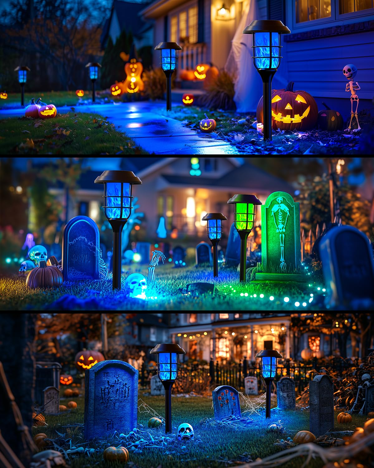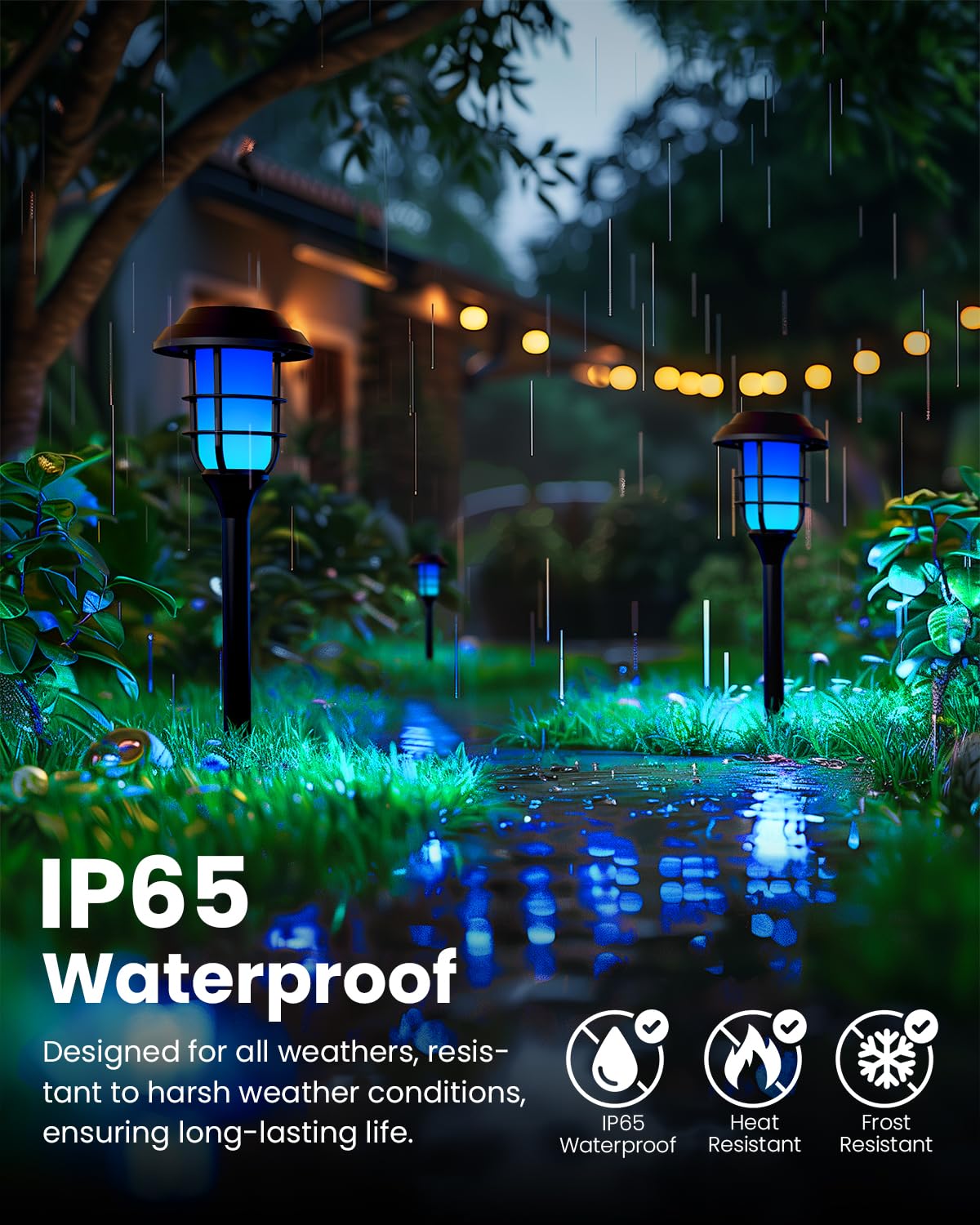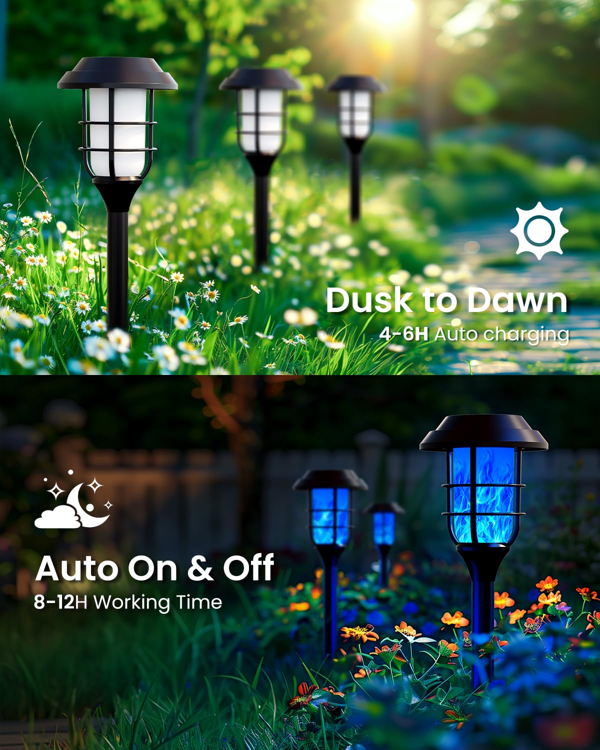 【Solar Powered Outdoor Decor】8-pack of blue flickering flame torch lights are powered by solar, a great addition to your Christmas decor.Automatically light up at night, requiring no electricity, and can provide up to 8-12 hours of illumination. 【FLICKERING FLAME EFFECT】These outdoor solar lights have flickering flame effect, emitted by SMD LEDs, which can simulate a dynamic effect similar to real flames. As a fall patio decoration, it makes your yard, patio, porch, backyard, and paths more charming. Making your christmas more enjoyable.