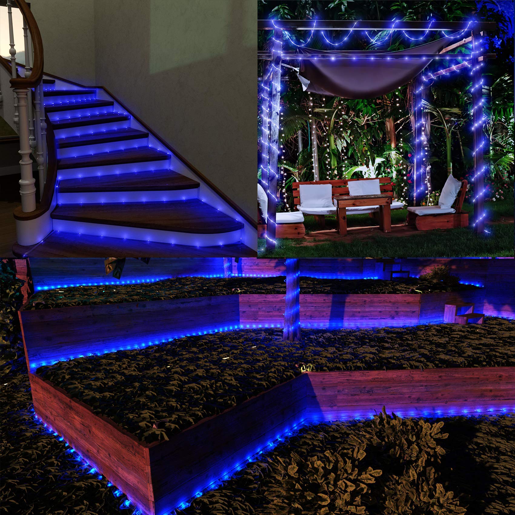 • 【 100 LED BLUE ROPE LIGHTS WITH 8 MODES 】 8 modes with different flashing frequencies are suitable for carnival, cheerful, warm and romantic atmosphere. The order of the lighting modes is: wave, fireflies, combination, chasing, twinkle, slowly, fading, steady-on. You can adjust the mode at any time through the buttons of the solar powered rope lights.