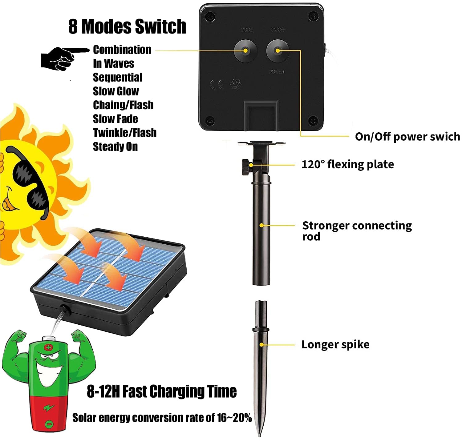• 【Up to 19% High Energy Conversion Rate】Our solar rope lights are equipped with 100 low-heat LED chips, achieving a high energy conversion rate of up to 19%, compared to the industry standard of 13%. These lights are not only environmentally friendly, harnessing endless energy from the sun, but also durable and safe to use. The LEDs will not overheat even after hours of usage.