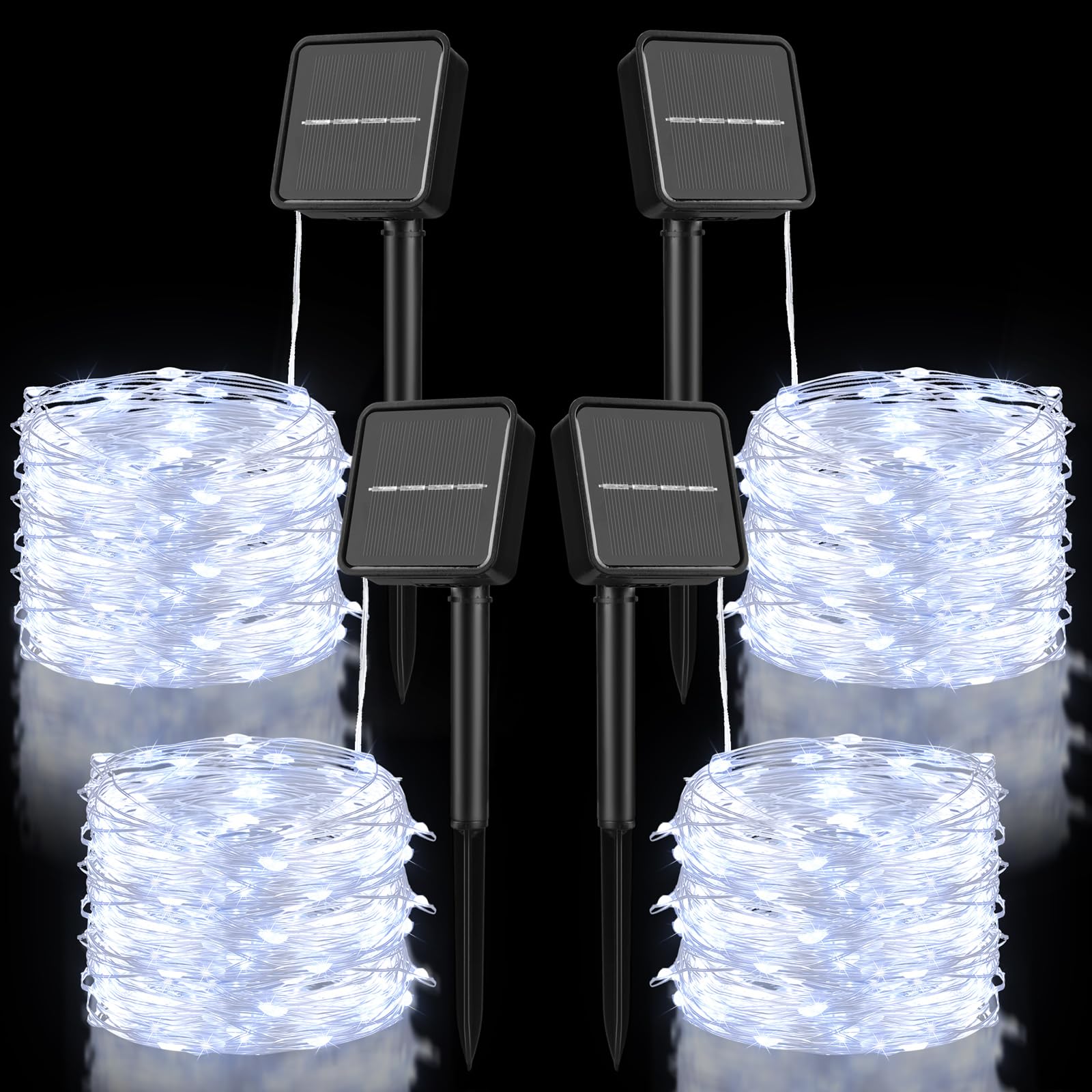 Package Includes: you will receive 4 pieces of outdoor solar string lights with 4 solar panels, each 33 ft/ 10 m long, equipped with 100 LED lights, emitting white light, enough to meet your use and replacement needs 8 Lighting Modes:the higher quality blue outdoor solar string lights have 8 gorgeous lighting modes You can adjust the effect you want on different occasions, the LED lights will create a warm atmosphere In the dark, when the solar powered light string turns on, the wires will fade to invisible, only leaving bright lighting that can make the decoration more beautiful and noticeable