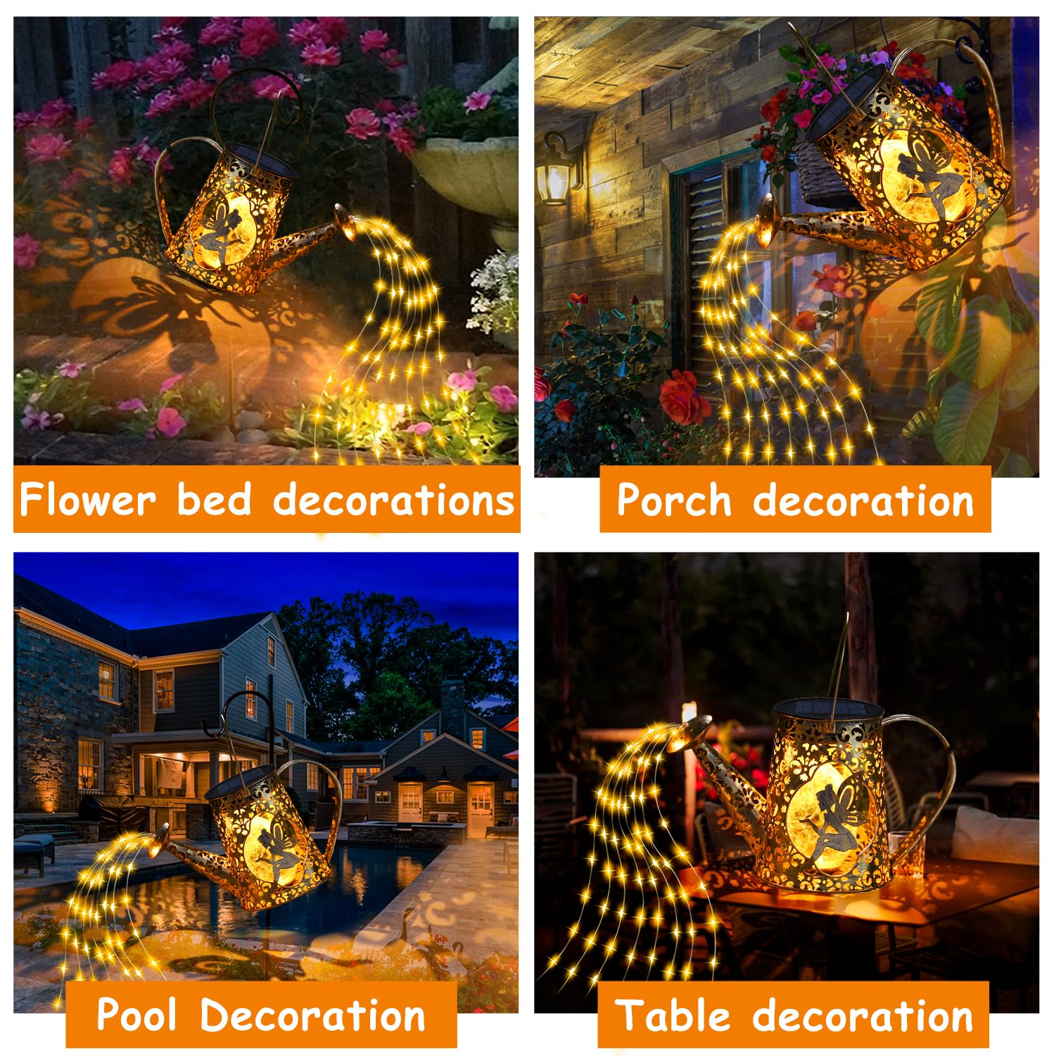 Perfect Decoration: The watering can lights will be an attractive decor in your garden,yard or outdoor during the night, this elegant and antique solar watering can emits warm yellow lights, looking like a string of shining stars poured from the watering can,projecting beautiful patterns on the ground ,to create romantic atmosphere. The garden light can bring you fantastic feeling in your garden, patio, lawn and yard at night Solar Powered: Built-in light sensor,this watering can solar lights will automatically turn on in the dark and turn off automatically during the day. This solar lamp can be used for 8-10 hours after charging for 6-8 hours. Tips: Please expose the solar panel to the sunlight, and make sure that the solar panel faces the sun directly