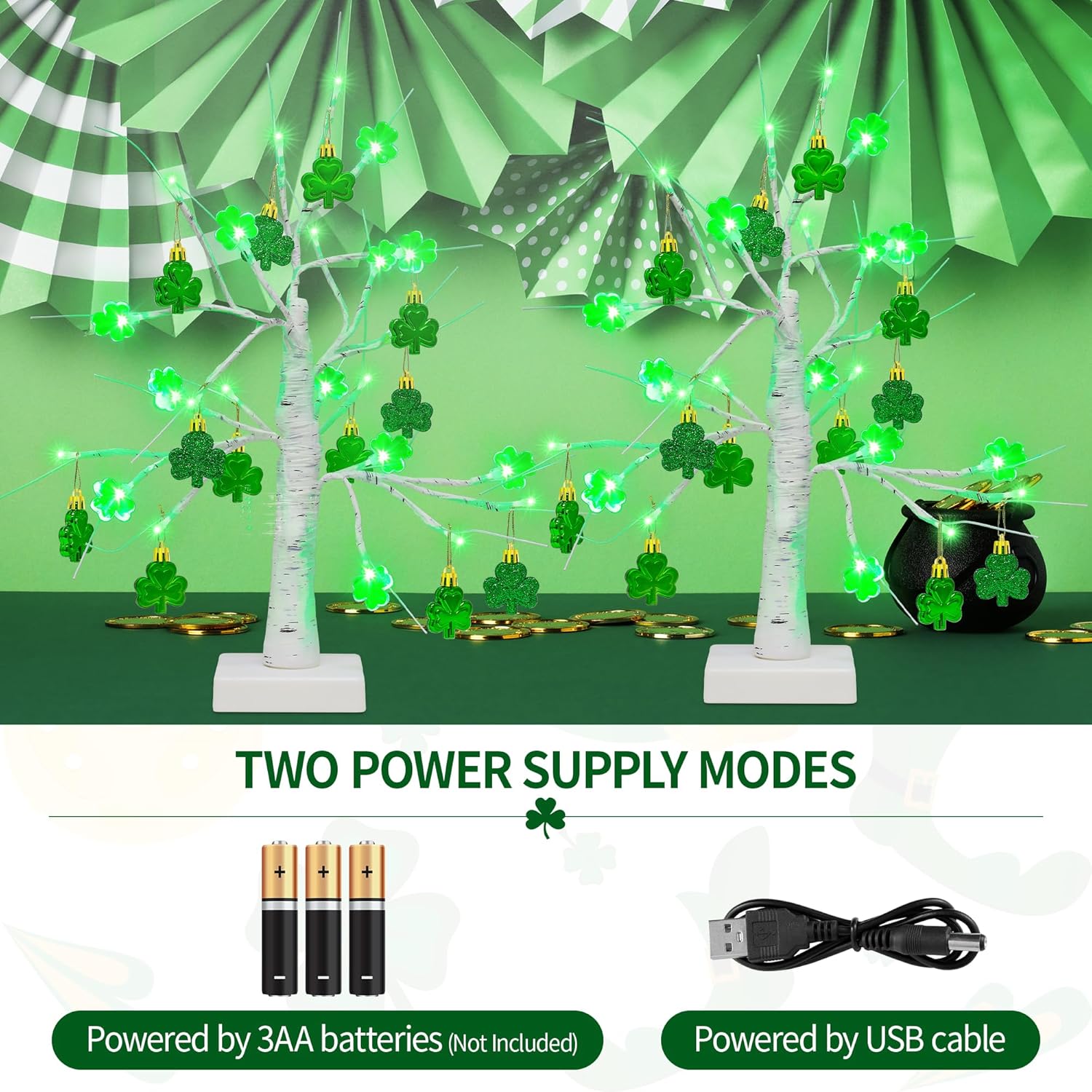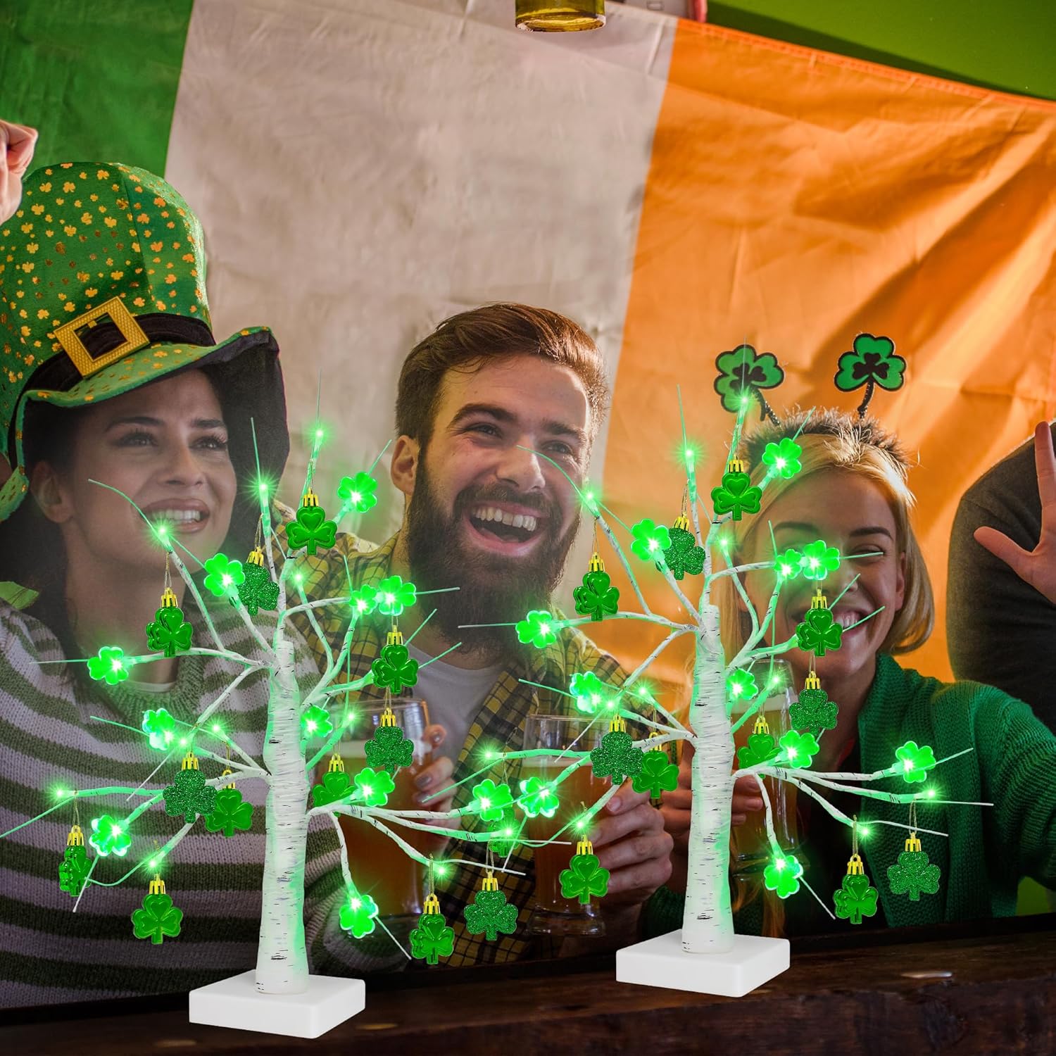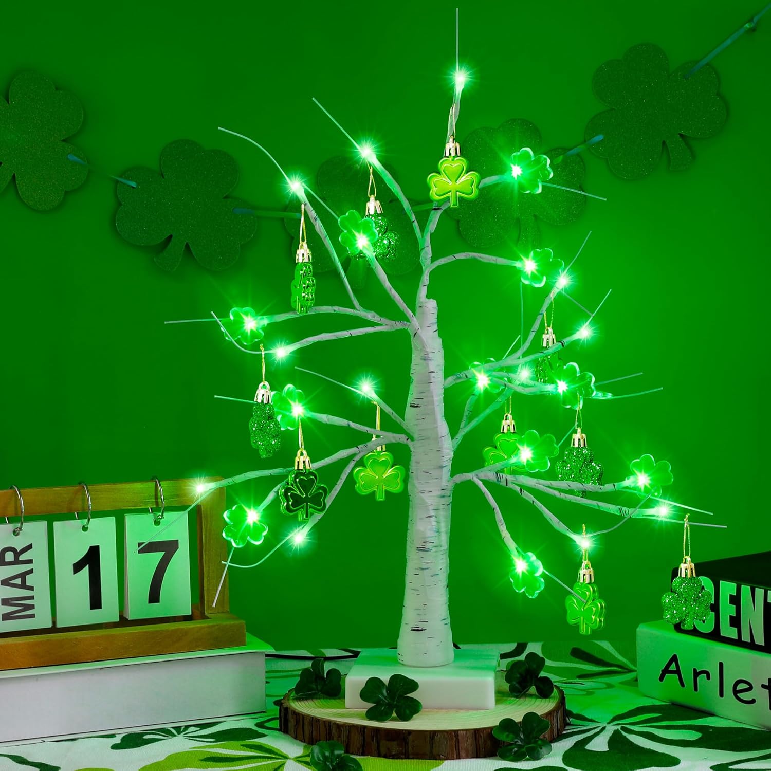 St Patricks Day Decorations, 18 Inches 24 LED Lighted Birch Tree Tabletop Decoration with 12 PCS Glitter Shamrock Ornaments, USB Battery Operated Lucky Tree Decor for St Patricks Day Irish Party