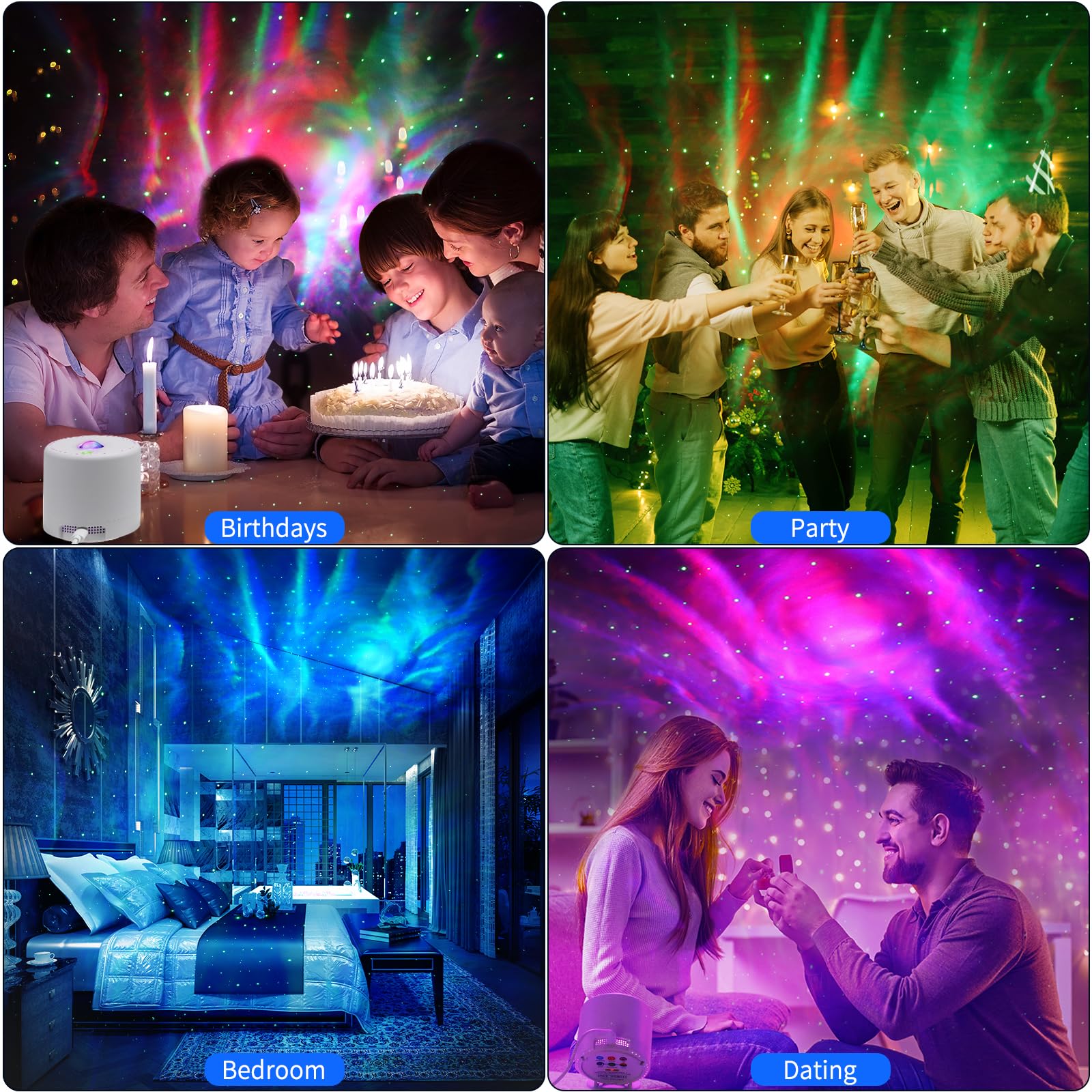 【Galaxy Projector】This Galaxy Projector is suitable for bedroom, living room, room, home theater, game room, friends party, holiday atmosphere decoration. The nebulae and stars of the starlight projector can be turned on individually or in combination, and the colorful RGB nebulae can be projected onto ceilings, walls, and car interior, creating a relaxing and romantic atmosphere for you. 【Star Night Light Projector】Projector has two ways of control: buttons on the back of the product and remote control. When you want to quickly adjust and control the product, the back button turns the power on and off, and adjusts the color of the light, the selection of stars and nebulae, and the sleep mode function on.