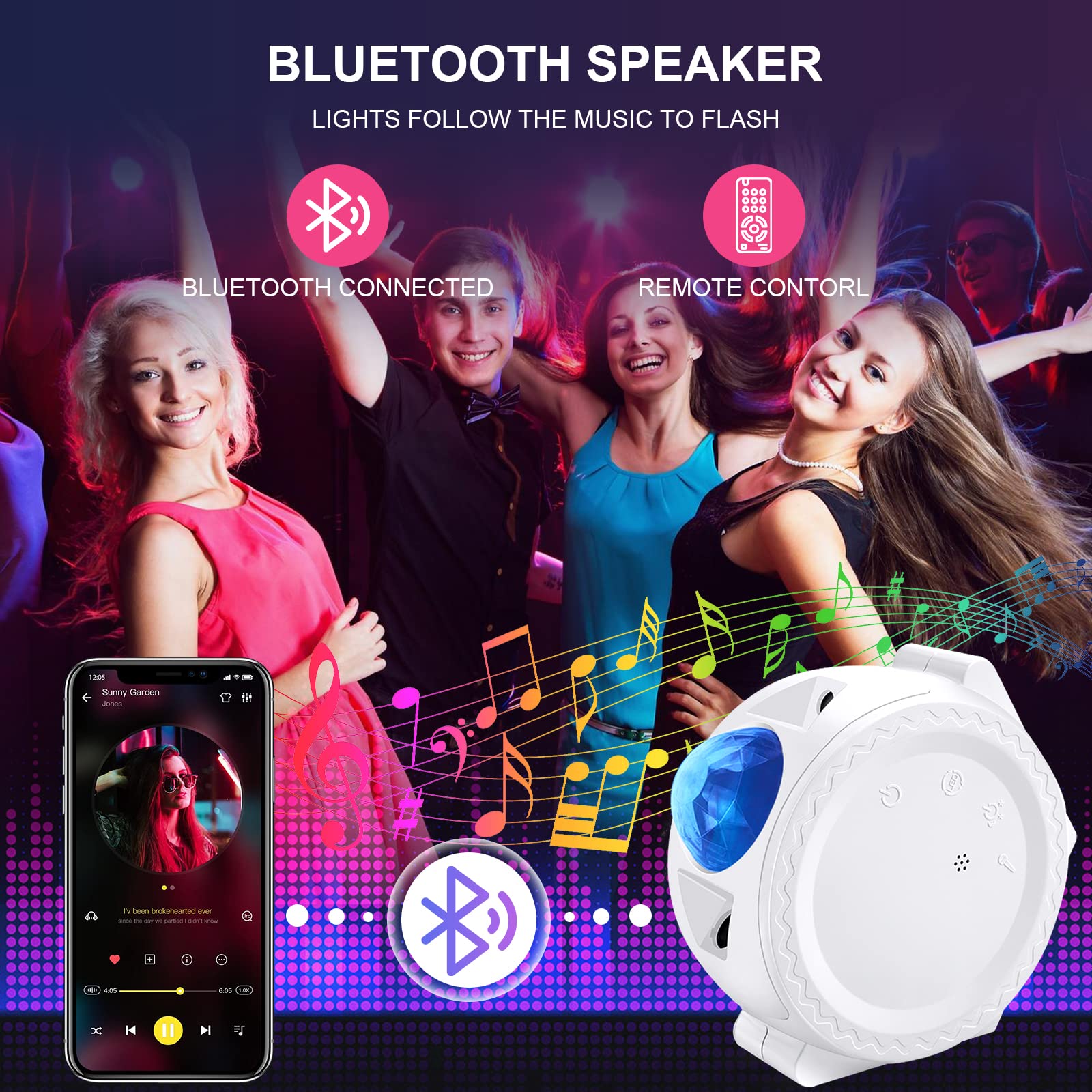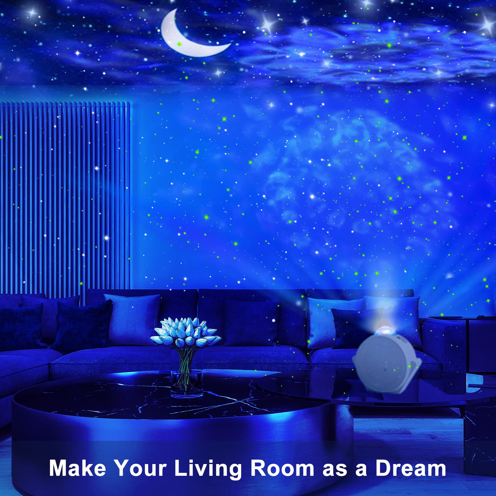 【Colorful Lighting Combination Projection】The star projector has three projection lens - water wave with 6 colors, unique moon and starry sky. You can singly choose the ocean ware lights mode or the moon and star lights mode, or combine them together. The sky projector features 18 kinds of light effect, High-resolution stars and moon rotate on the ceiling or wall, colorful nebula cloud float quietly under the night sky, let you experience the colorful starry sky night. 【Bluetooth Speaker&Adjustable Base】The star projector has the bluetooth Speaker function and it can be a bluetooth speaker. So you can enjoy the music from your Phone or Other device.3 angles of the base options are available to meet your needs in any indoor places, the galaxy projector can play the projection on ceiling, on wall or other direction you want. LED starry light projector can completely cover the ceiling of a 200-foot room.