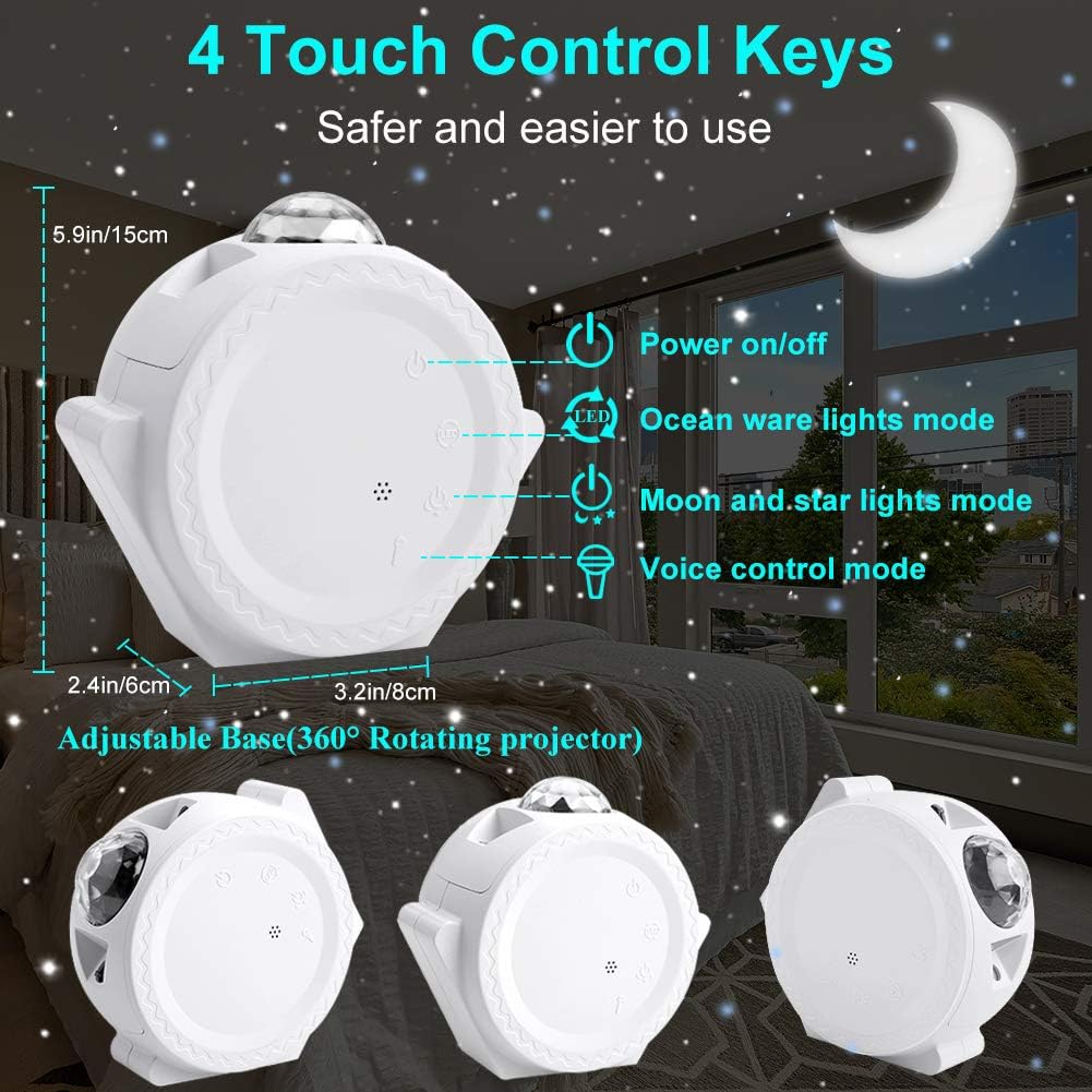 • 【Remote&Touch Activate Flicking Star Light】You can control the galaxy projector with the remote. Besiedes, 4 touch buttons make it easier for adult and children to use. (Power On Ocean Ware Lights Moon and Star Lights Voice Control). Start the voice control mode, all the light is off, while the star light senses sound, such as playing a song or clapping your hands, the lights will flash according to the rhythm of the sound, create a relaxed and warming atmosphere.