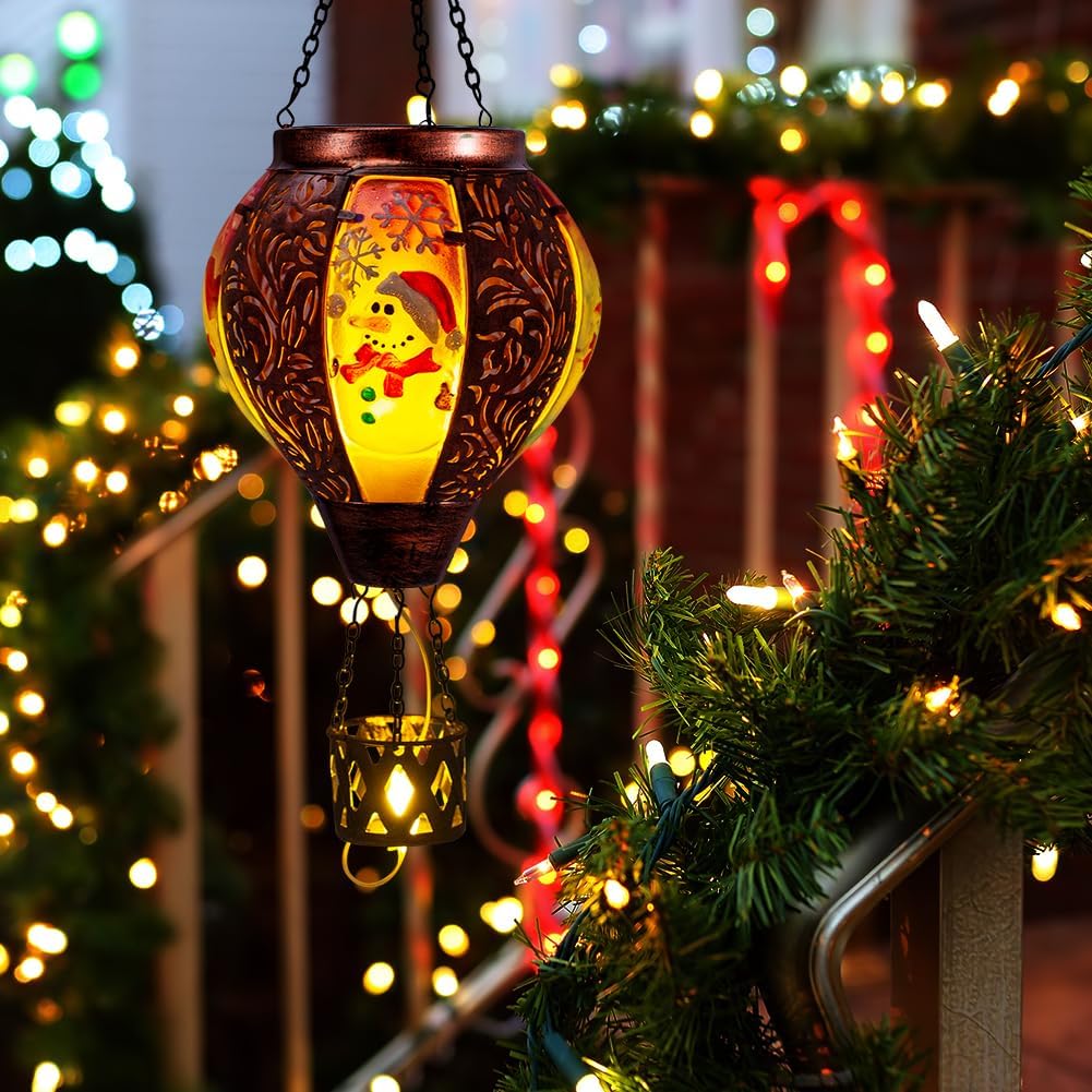 Starsoul Christmas Hot Air Balloon Solar Lantern Waterproof Snowman Solar Hot Air Balloon Lantern with Flame Outdoor Hanging Christmas Snowman Lanterns Decorations for Garden Porch Patio Yard (Red)