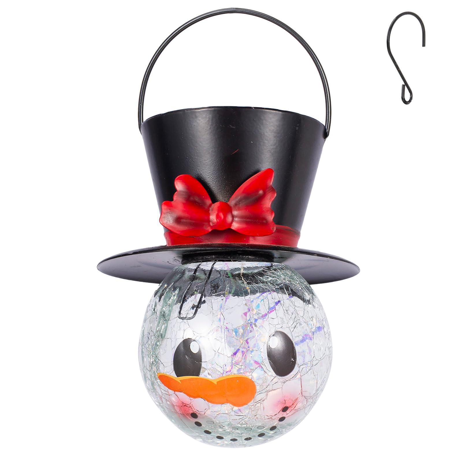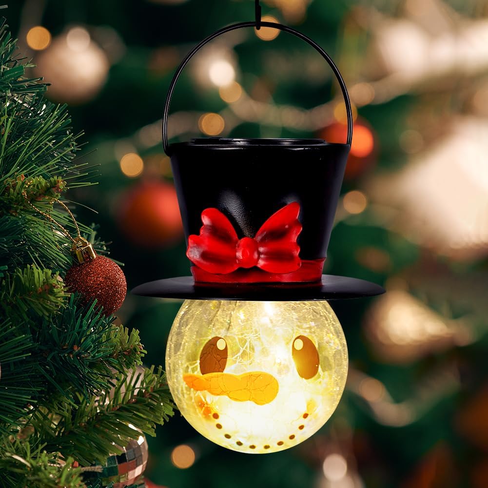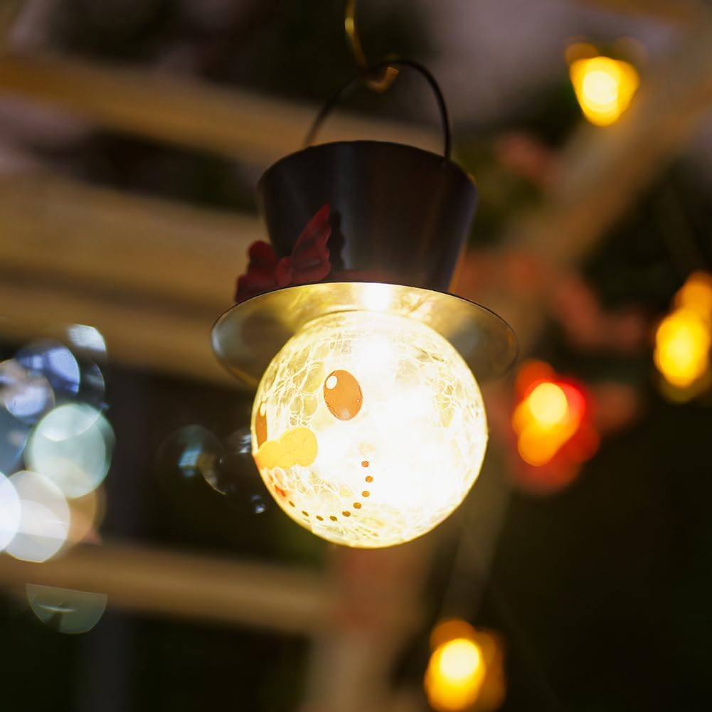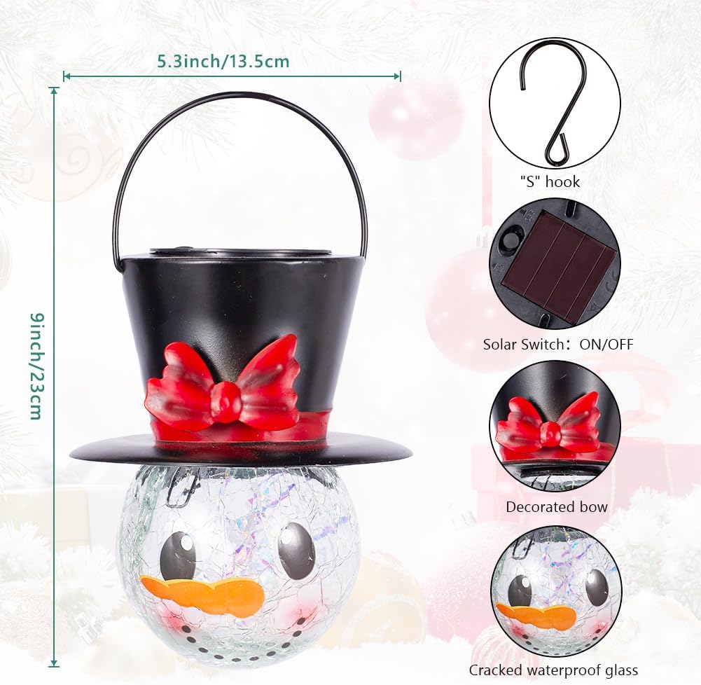 【Snowman Solar Lantern】: This solar christmas lantern features features a smiling snowman face illuminated from within, casting a warm, inviting glow. The top hat, adorned with a vibrant red bow, adds a whimsical touch. Perfect for adding a touch of holiday cheer to your outdoor spaces. 【Snowman Solar Lights】Solar snowman lantern size: 3.53" Dia 5.9"H, 1.33 lbs/pc. When using for the first time, pls move the switch button to the ON position. The outdoor hanging christmas decorations will start to work, charge during the day and turn on at night.