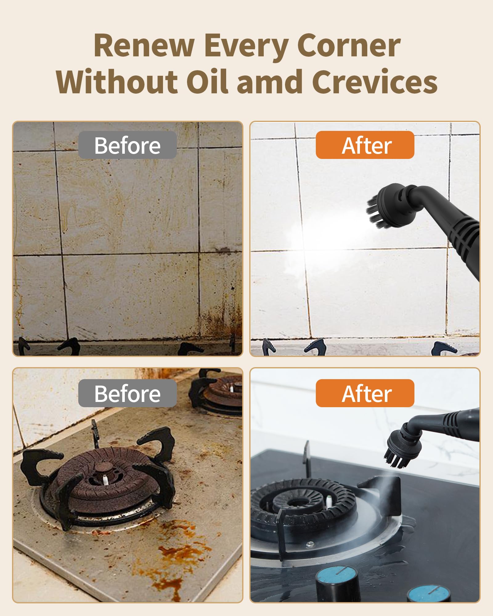 • 21 MultiFunctional Accessories Clean Without Deadly Corners Steamer for cleaning is with 21 multifunctional accessories, you can adjust it as you like according to your cleaning needs, it can meet your daily home cleaning needs. Suitable for sinks, stoves, countertops, refrigerators, kitchens, floors, living rooms, windows, bathrooms, tiles, shower curtains, toilets, pet toilets, kitty litter boxes, car seats and edges, barbecues, toys, mattresses, linens, duvets, fabrics and sofa materials, clothing and fabrics