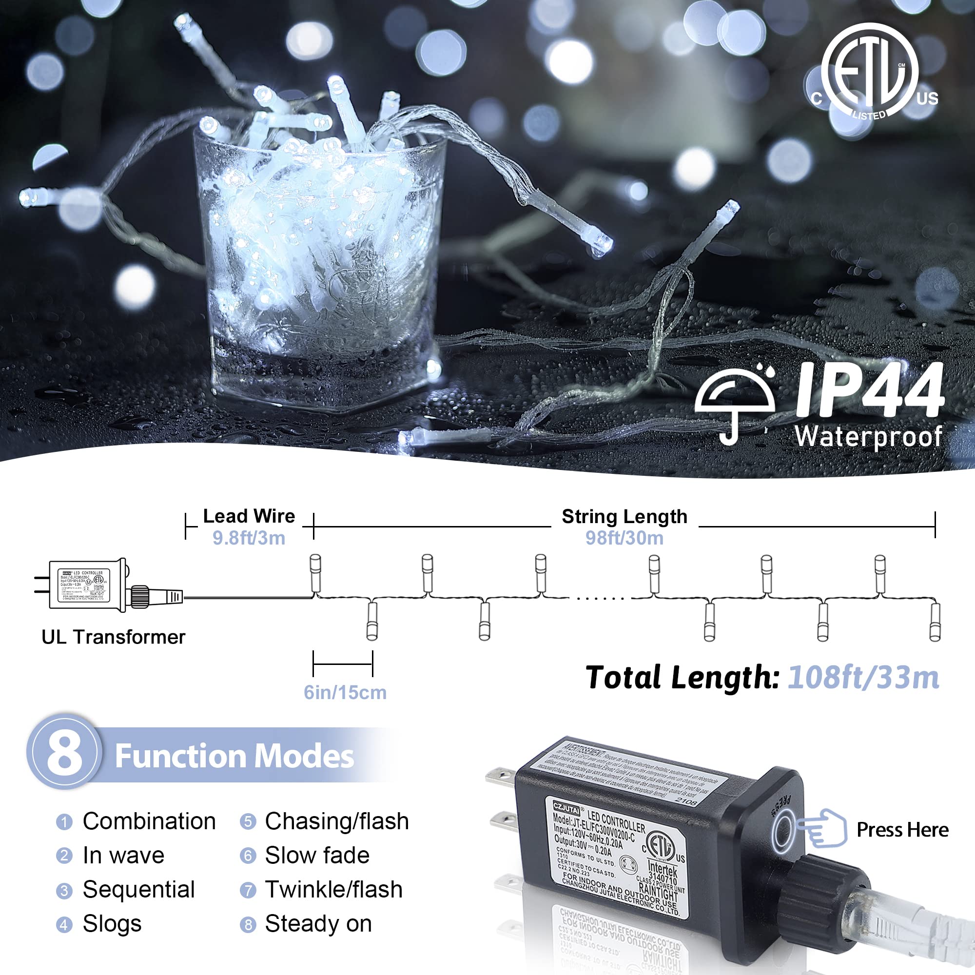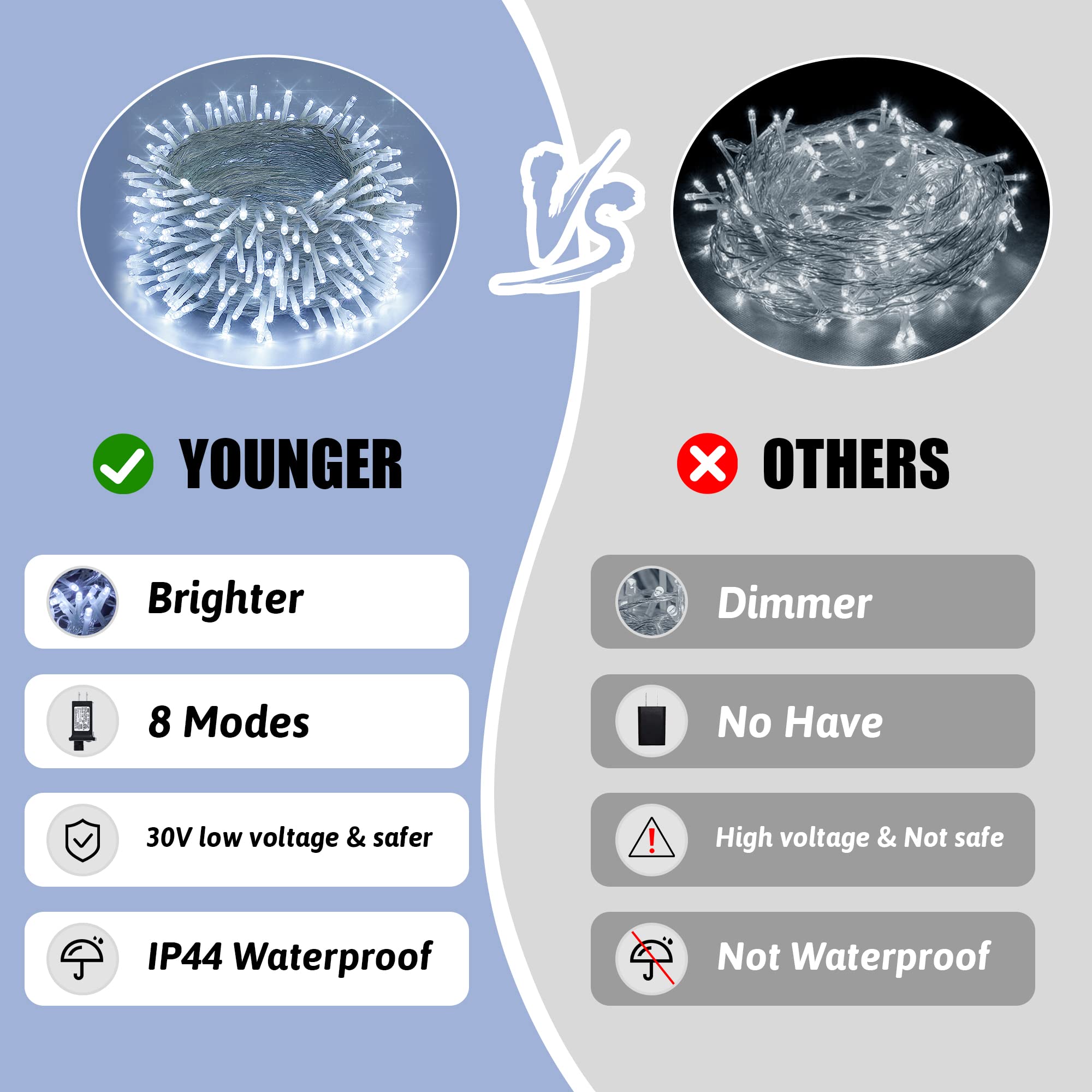 🎁Bright & Soft Design🎁: YOUNGER 200LED super bright white Christmas lights, although bright but never blinding. The total length of the string lights is 33m/108ft,the String Length is 30m/98ft,the Lead Wire is 3m/10ft and Space between LED is 15cm/6inch. It is enough to decorate your beautiful home. Hanging this white string lights will make you feel like you are in a world of ice and snow. Choose us, I'm sure every day will be like Christmas for you. 🎁Safety & High Quality🎁The Christmas tree lights passed ETL and is the best choice for your indoor and outdoor decoration. The output voltage of the light is only 30V, which is lower than the human body safety voltage, no danger of electric shock. Even if used for a long time, the lights will not overheat. 9W low power can save energy when using. To ensure you get the best product, our lights are strictly inspected before leaving the factory, you can choose us with confidence