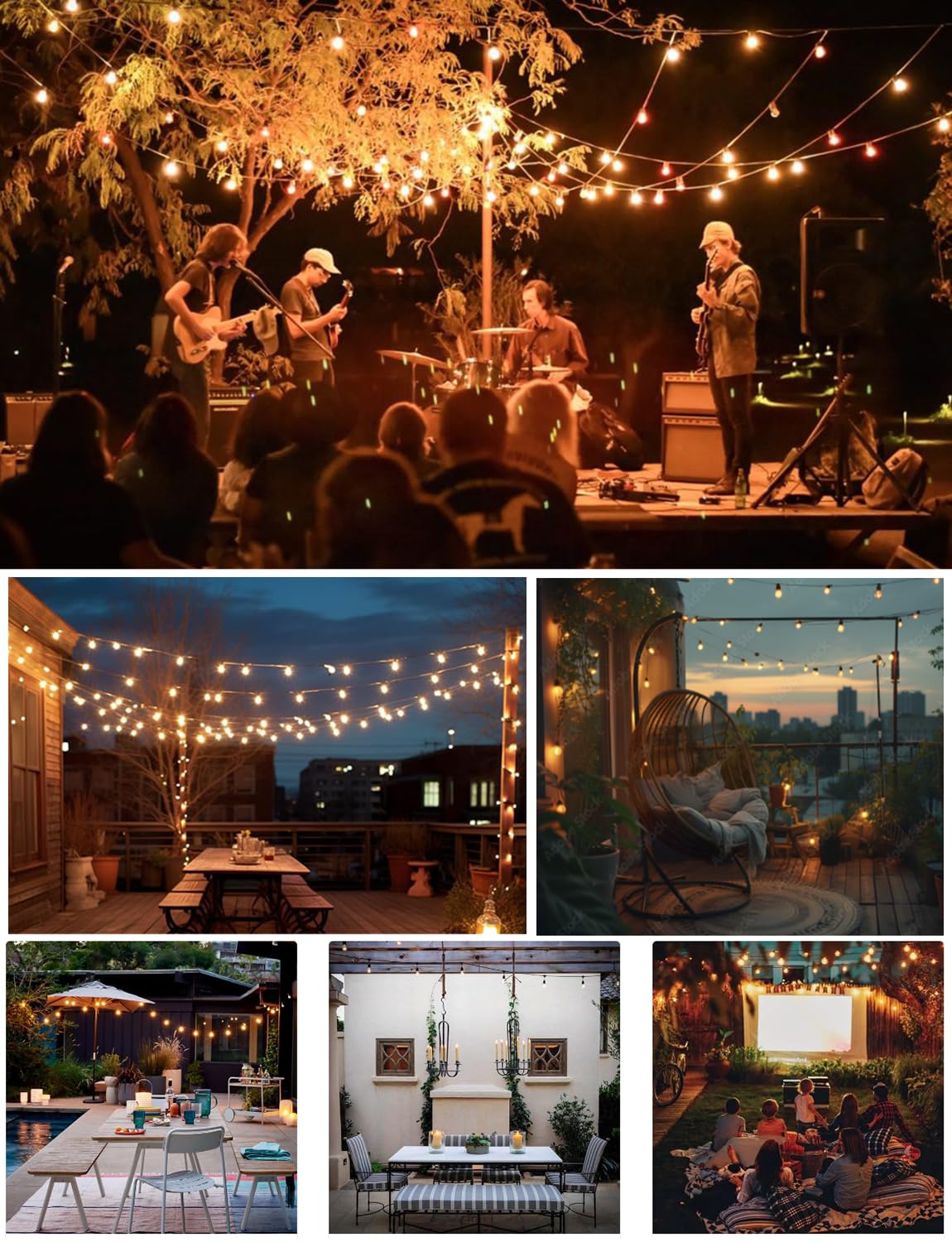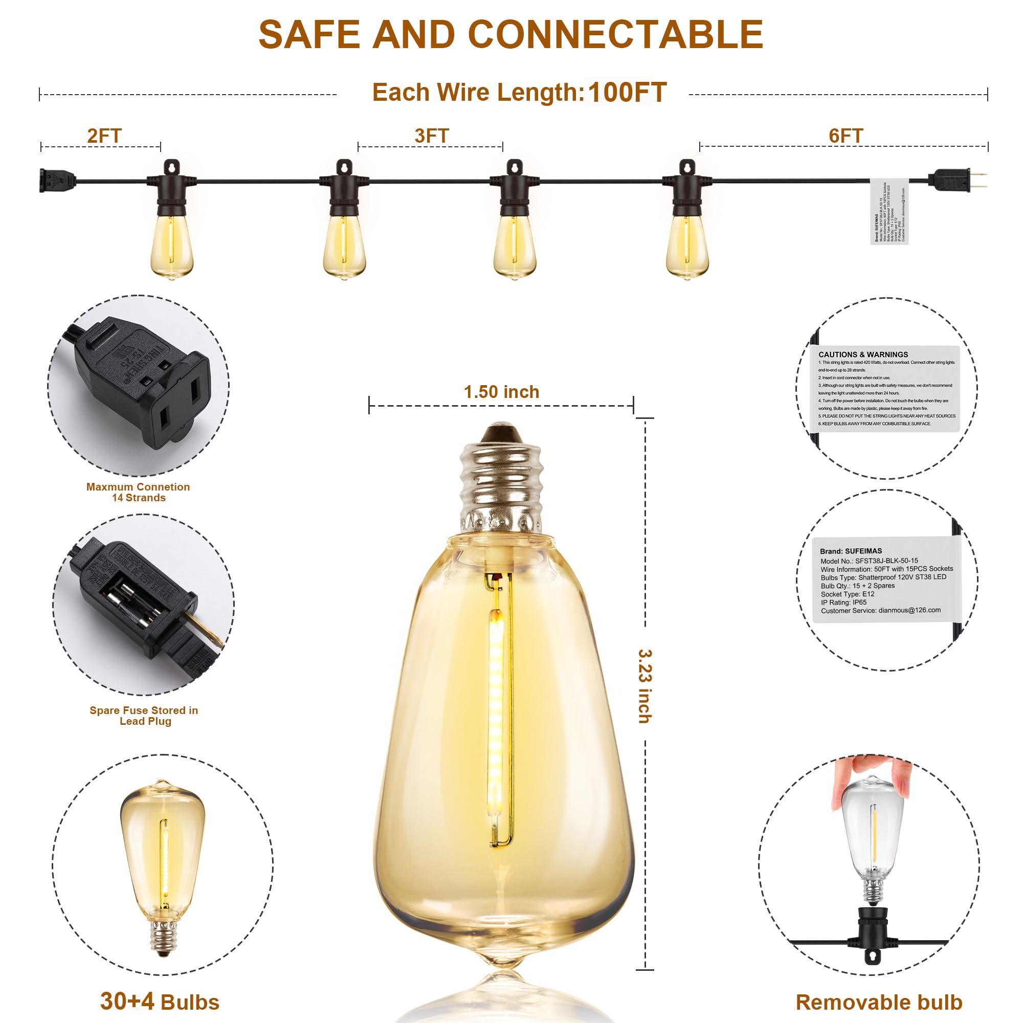 • 🔗【Connectable String Lights】- Our 100-foot outdoor string lights have end-to-end connection capability. Connect up to 28 strands using nails, carabiners, hooks, zip ties, or guide wires. Cluster or hang straight across a large area. Extend up to 28 X 50 feet strands. Easy installation with 6FT plug-to-first-bulb distance, 3FT bulb spacing, and 2FT from last bulb to end.