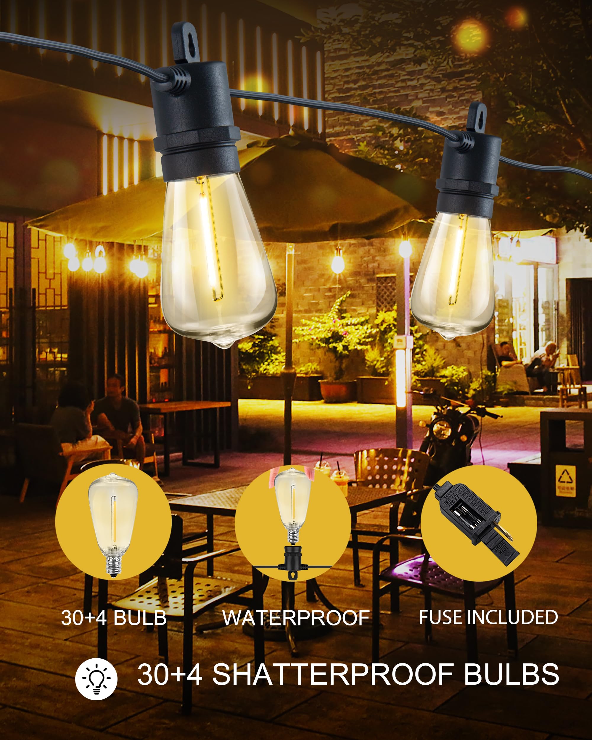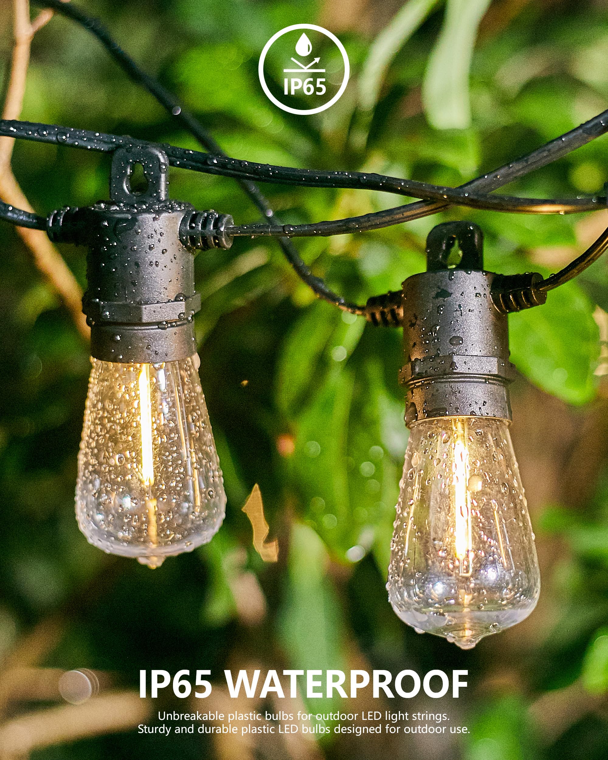 • 🎉【Shatterproof String Lights for Outside】- Our 2 X 50 FT outdoor string lights are made of high-quality materials. 2 X 15pcs E12 sockets with 15+2pcs 1W plastic LED bulbs (2 extra). They won't break even if they fall. Create a delightful ambiance for birthdays, weddings, or banquets. Commercial-grade lights bring warmth and joy to your family, friends, and guests.