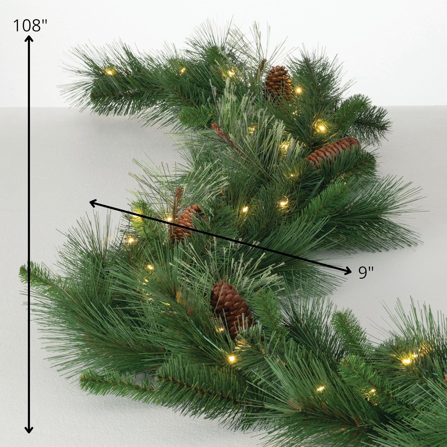 Sullivans 9' Prelit Christmas Garland, Christmas Decor, Garland Christmas Decorations, Artificial Pine Garland For Mantle with Lights, Pinecone Accents, Warm White Lights, Battery Timer, Holiday Decor