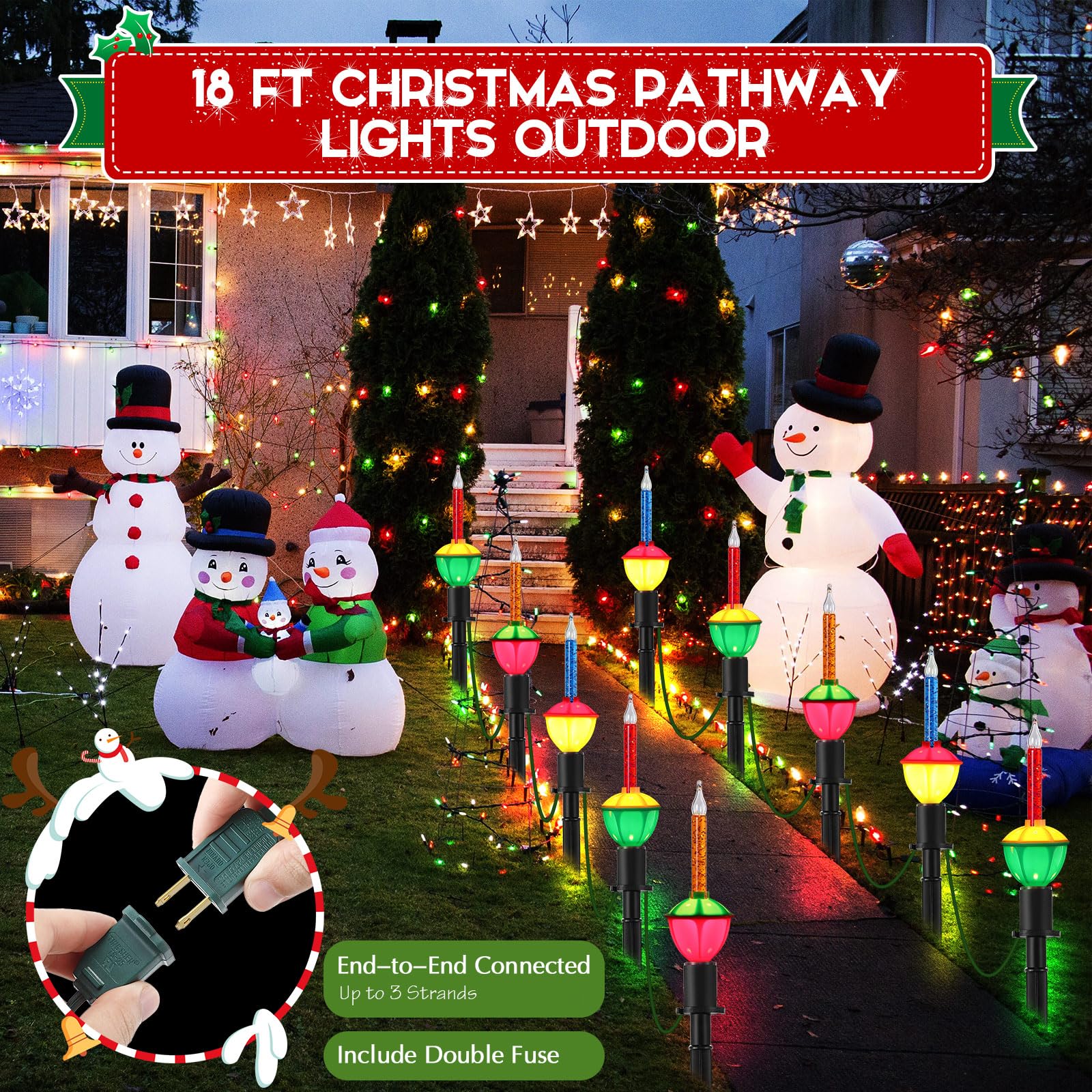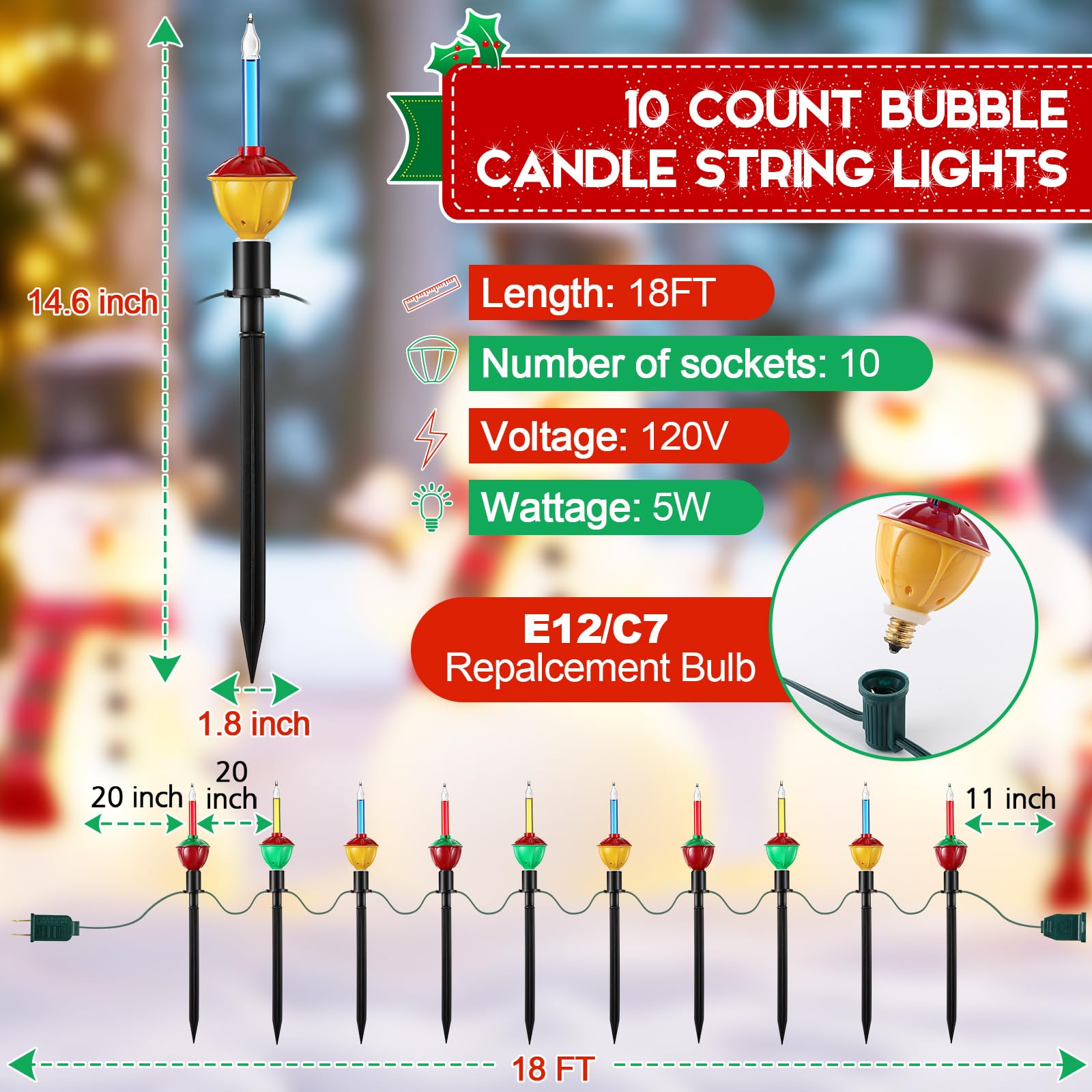 10 Bubble Candle Christmas Lights: You'll receive an 18 foot string of outdoor sidewalk Christmas lights with 10 multicolor bubble lights and ground inserts The color of the bubble liquid is yellow, red, and blue The power cord is 16 inches, the light spacing is 20 inches, and the tail line is 11 inches Sidewalk Christmas lights are long enough in size and number to meet your outdoor needs End to End Design: The Christmas decoration multicolor bubble light strings are end to end, each bulb has a power of 5W, and up to 3 strands of the same traditional Christmas bubble light can be connected, with a maximum power of 150 watts Sidewalk Christmas lights are good for outdoor trails, lawns, gardens, yard lighting or decorating