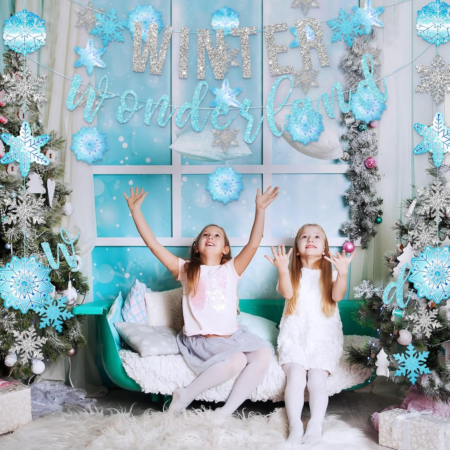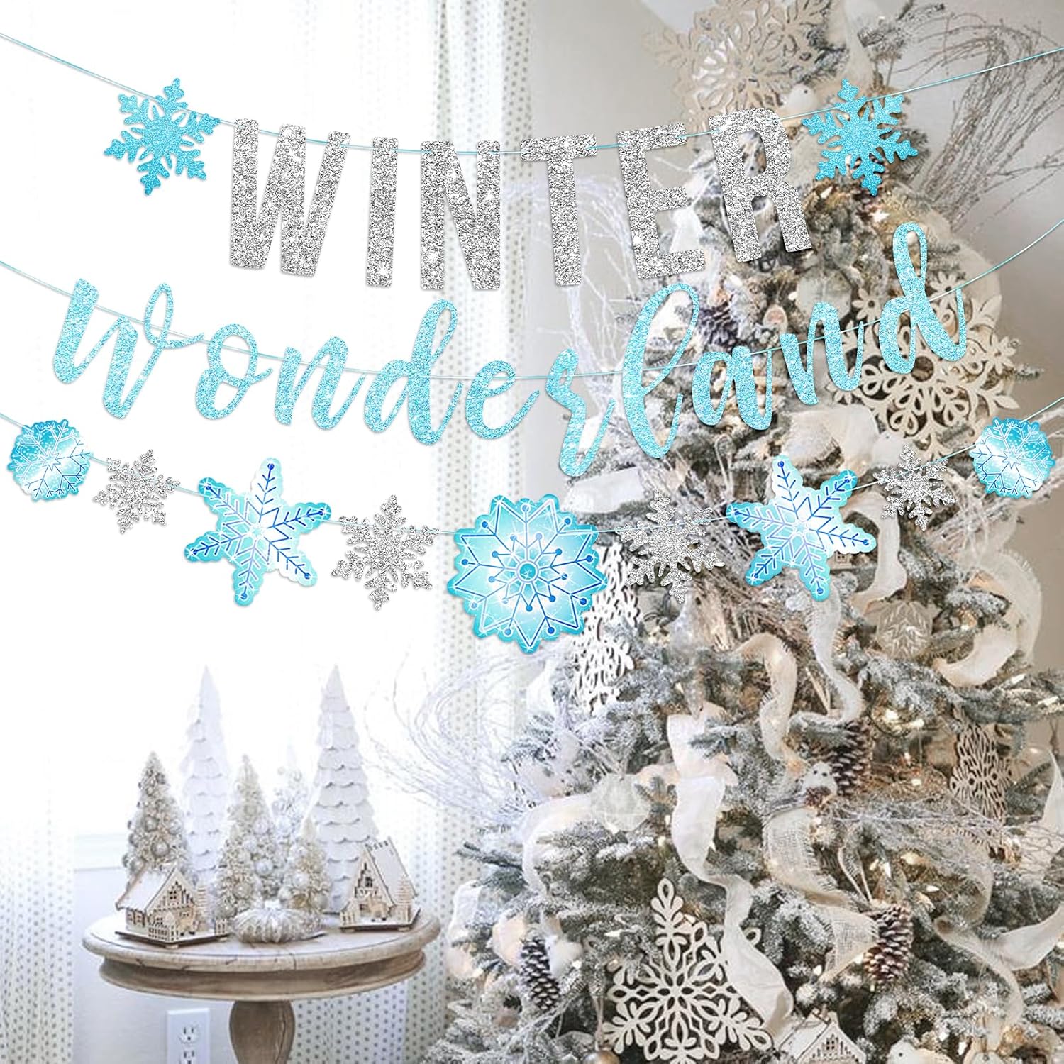 SUNBEAUTY Winter Wonderland Decorations Snowflake Garland Banner Winter Wonderland Snowflake Decorations for Happy Holidays Christmas Wedding Winter Wonderland 1st Birthday Party