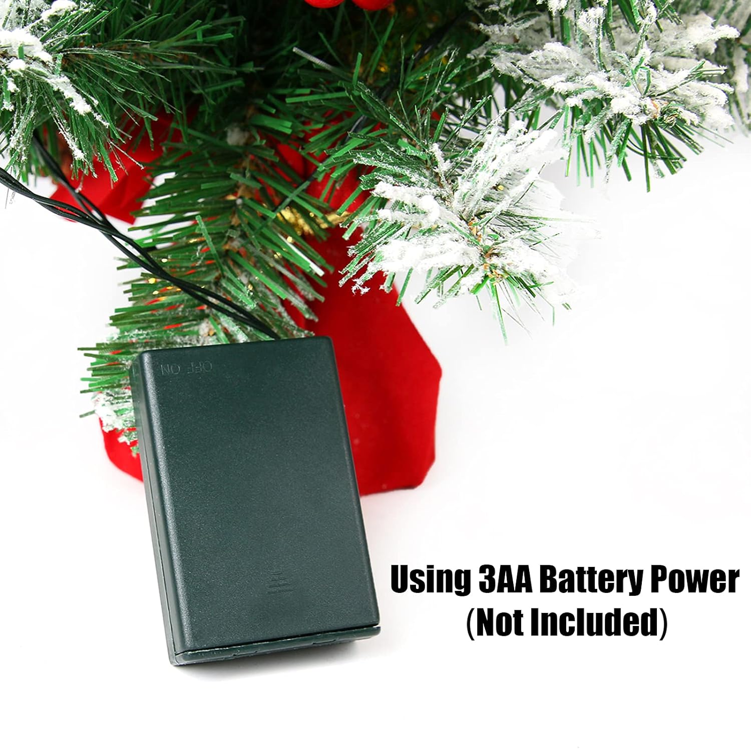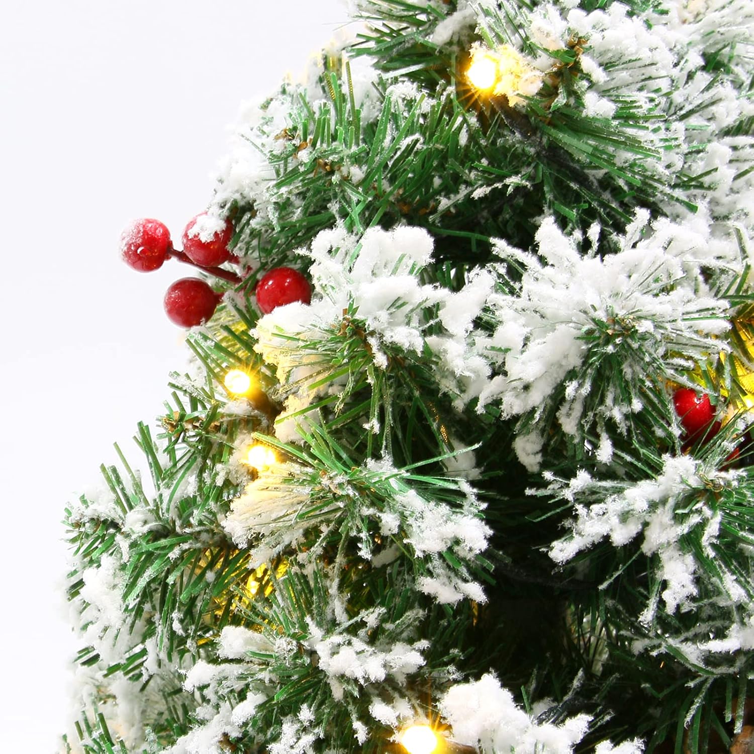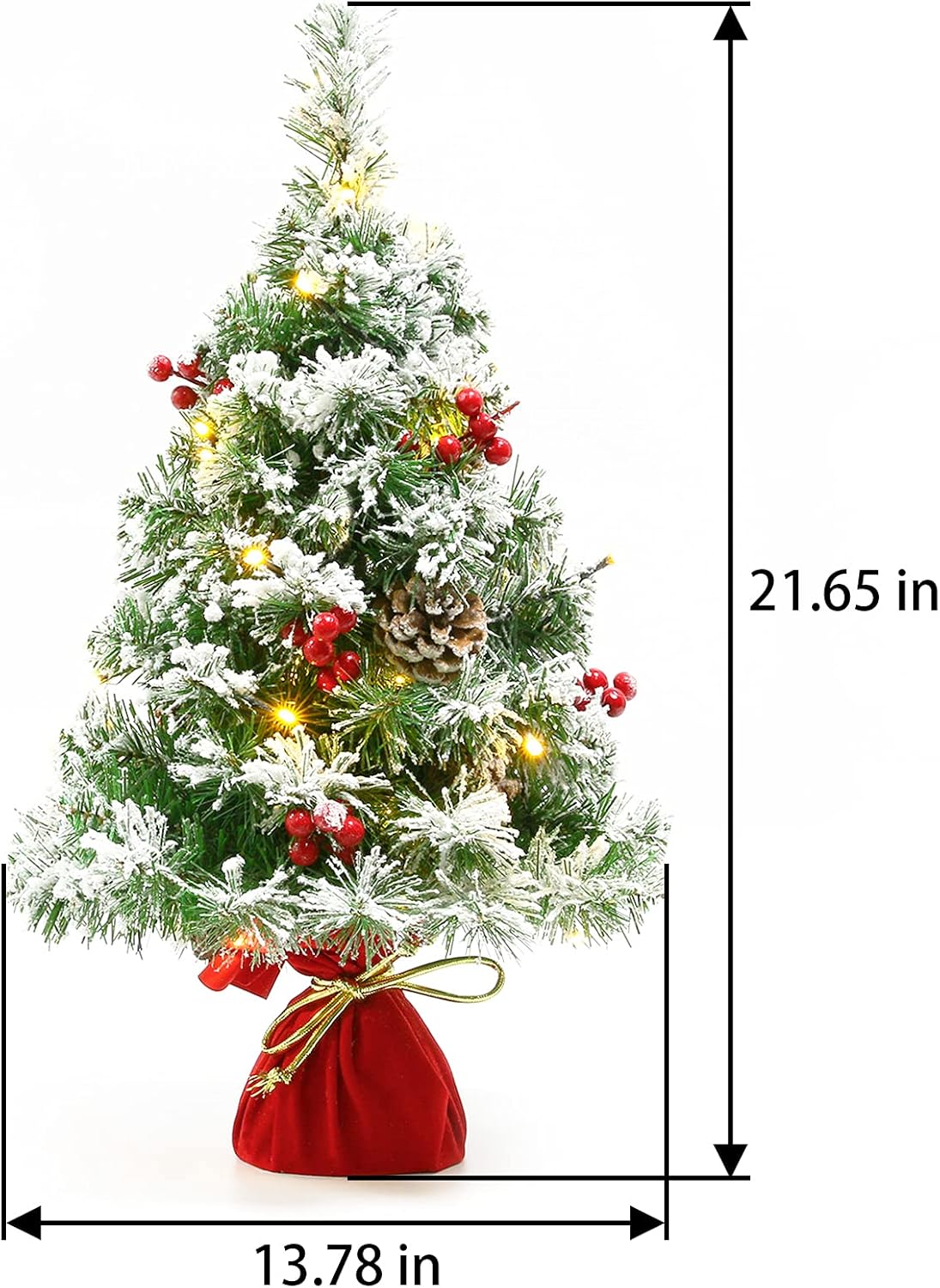 Sunnyglade 21.6 inch Snow Flocked Christmas Tree Artificial Mini Christmas Tree Pine Tree Indoor Tabletop Ornaments Decorations with 30 LED Lights,Red Cloth Base and Pine Cones,White