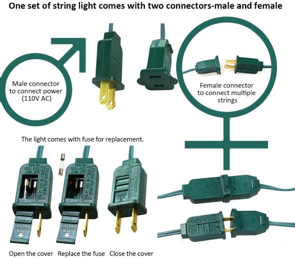 G40 globe string lights are made of 25 feet long string used to connect 25 clear G40 Bulbs. 6” lead with male plug, 12” spacing between bulbs, 6” tail with female connector. Each strand has end to end connections, so that you will easily be able to attach up to 3 strands to cover large areas. Even with broken or removed bulbs, remaining bulbs will continue to light up Energy-efficient 5W bulbs, E12 candelabra base, 125W per string 110V Power Comes with Spare Fuse UL Listed for general indoor/outdoor applications. Bulbs can be replaced by any Candelabra (E12) ones that single bulb not exceed 7W. Connects up to maximum 3 strands, total strand load that powered by one outlet can't exceed 432W