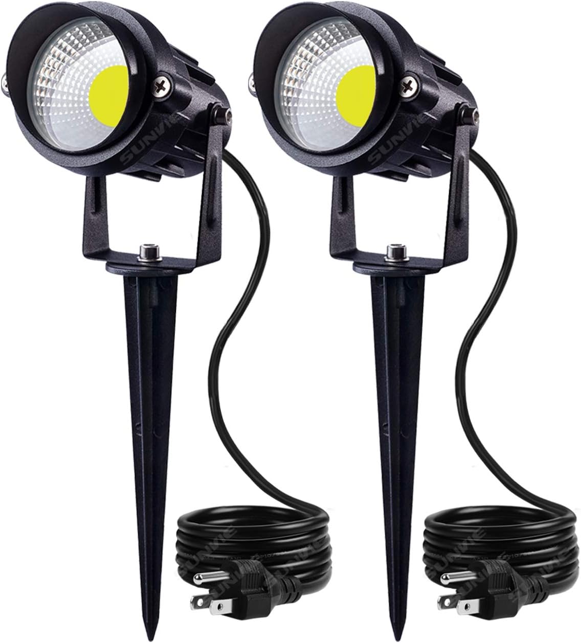 SUNVIE Outdoor Landscape LED Lighting 12W Waterproof Graden Lights COB Led Spotlights with Spiked Stand for Lawn Decorative Lamp US 3- Plug 6500K Daylight White (2 Packs)