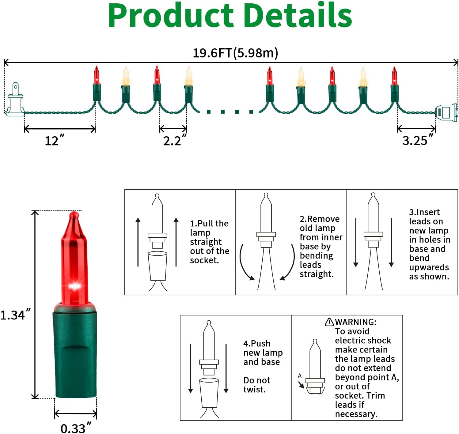 100 incandescent Christmas Lights: Old-fashion incandescent Christmas red+ warm white lights, creates a warm festive atmosphere, surely lights up your room and house. A warm welcome sign at night to make your home a wonderful sight for your neighborsGreen Wire Decorative Lights: Decorate with 100 red+ warm white incandescent mini lights with green wire will give a soft festive feel to your Christmas. Each bulb space 2.5in, 2.5V and 0.425W per bulbs, built-in 3A fuse for safe use. Extra bulbs and fuses are included.