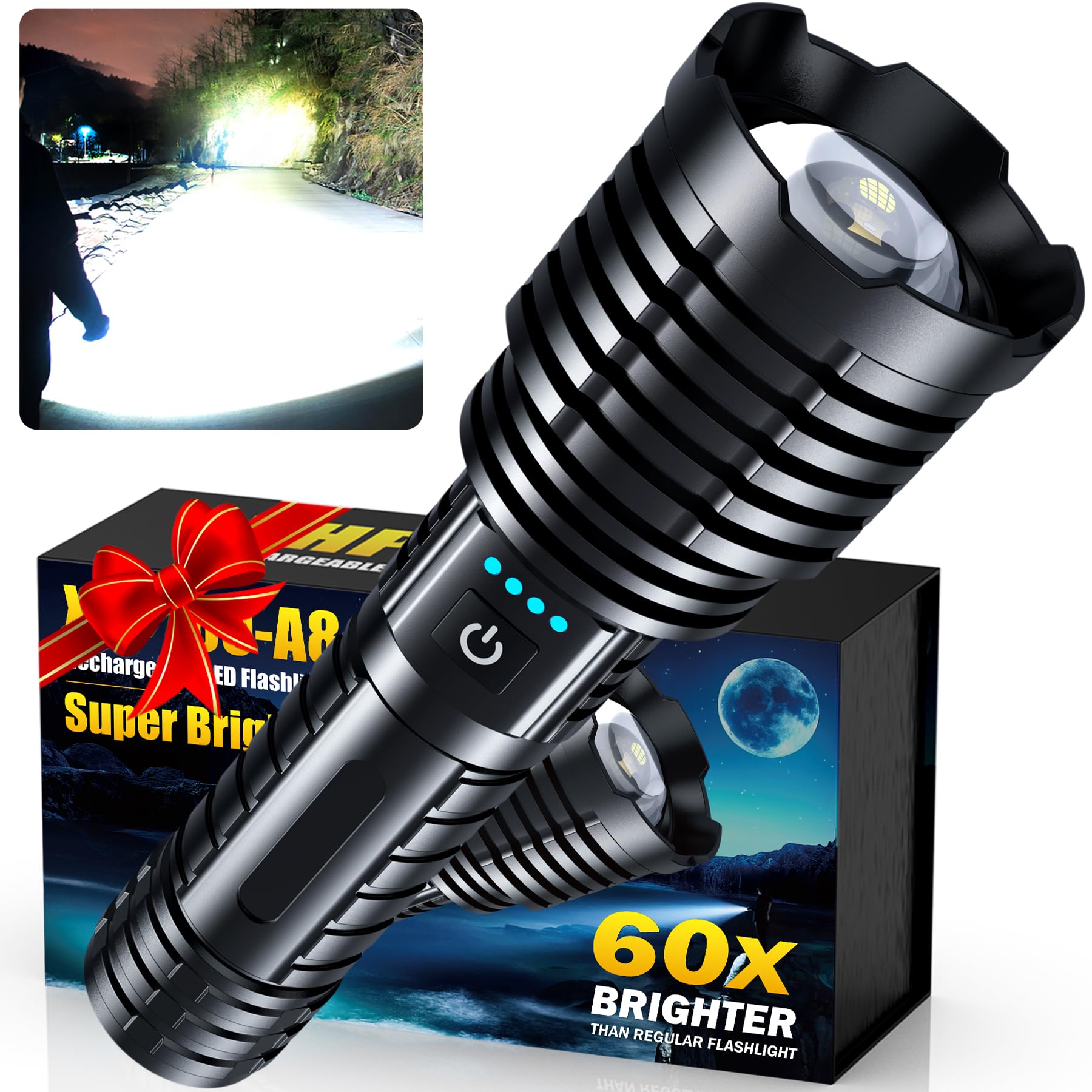 out this item ☀️ Brightest Flashlight: Our upgraded flashlight 5000.000 high lumens is a beacon of light in the darkest of environments. Powerful flashlight for outdoor adventures, hiking, camping, emergency preparedness, household tasks, and professional use. 5 Light Modes ? Zoomable Design: This strong flashlight has 5 lighting modes: High, Medium, Low, Strobe and SOS. You can turn them off by long pressing the buttons for 3s in any mode. Depending on your needs, you can stretch the head of the flashlight to adjust the focus, the spotlight for long-distance observation and the floodlight for large area lighting. Type-C Fast Charging & Battery Operated???: Enjoy the convenience of dual power options and say goodbye to frequent battery purchases. Our rechargeable flashlights supports fast charging via Type-C, ensuring reduced wait times and enhanced functionality. Additionally, it includes a 3xAAA Battery Adapter (3AAA Batteries not included) for backup power, ensuring reliable performance during emergencies. Wherever you find yourself, our product offers versatility and dependable performance precisely when you need it most. ?Shockproof & IP67 Waterproof: Crafted for precision and durability, our led flashlights high lumens features aviation-grade aluminum construction for enhanced strength and heat dispersion, ensuring optimal performance even during extended use. With an IP67 waterproof rating, it offers durability in harsh weather.The use of aviation aluminum underscores a commitment to quality, making this rechargeable flashlights high lumens a robust companion in various situations. ?Long-lasting Ultra Bright Flashlight with Power Display: Equipped with a 5000mAh battery, our flashlights high lumens rechargeable typically requires 5 hours for a full charge.(Caution: It is strictly prohibited to charge a flashlight without a battery, otherwise it may damage the flashlight.) Once charged, it can provide up to 25 hours of continuous usage. Moreover, our most powerful flashlight features a power display function: Blue for high power/full charge, and red for charging/needs recharging. Enjoy reliable performance and clear power status updates for uninterrupted illumination whenever needed. ?Package List & After-Sales?: Bright flashlight*1, Type-c cable*1, Instruction manual*1, 5000mAh battery*1,Battery Hoer and Tube*1. If any accessories are missing, you can ask us for a replacement.And we will solve any after-sales problems that occur due to non-human reasons